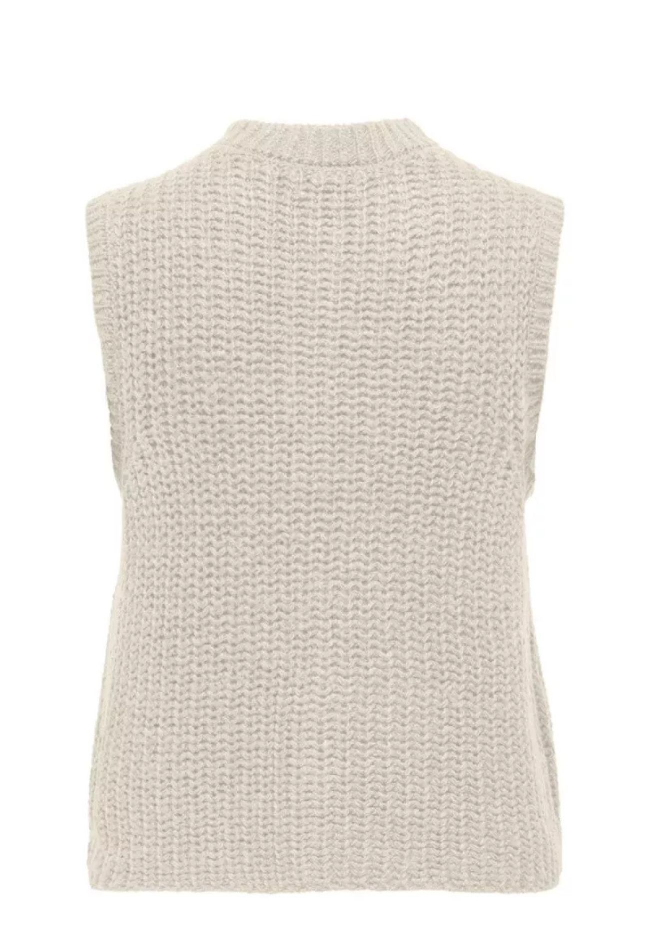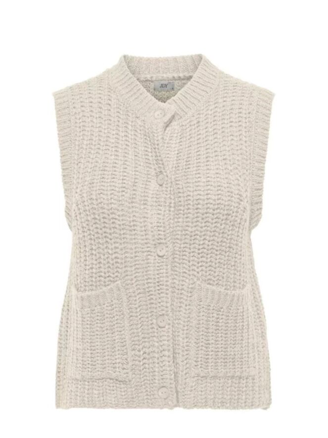 Dit grof gebreide gilet draag je ontzettend leuk over een mooie bijpassende blouse. Sluitend met knopen en 2 kleine opgestikte zakjes voorop.