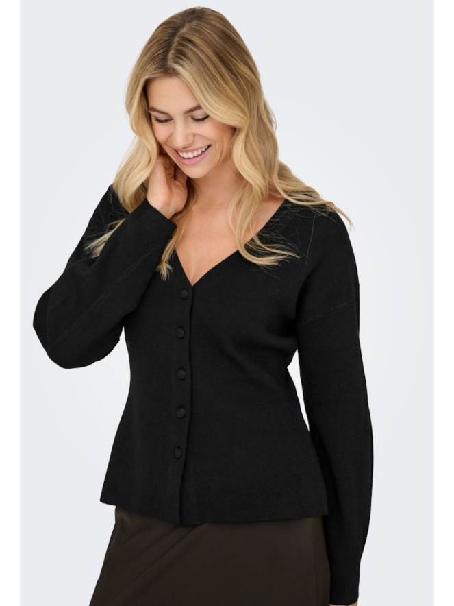 Fijn gebreid vestje met diepe V hals. Sluitend met knopen en heeft een getailleerde pasvorm.