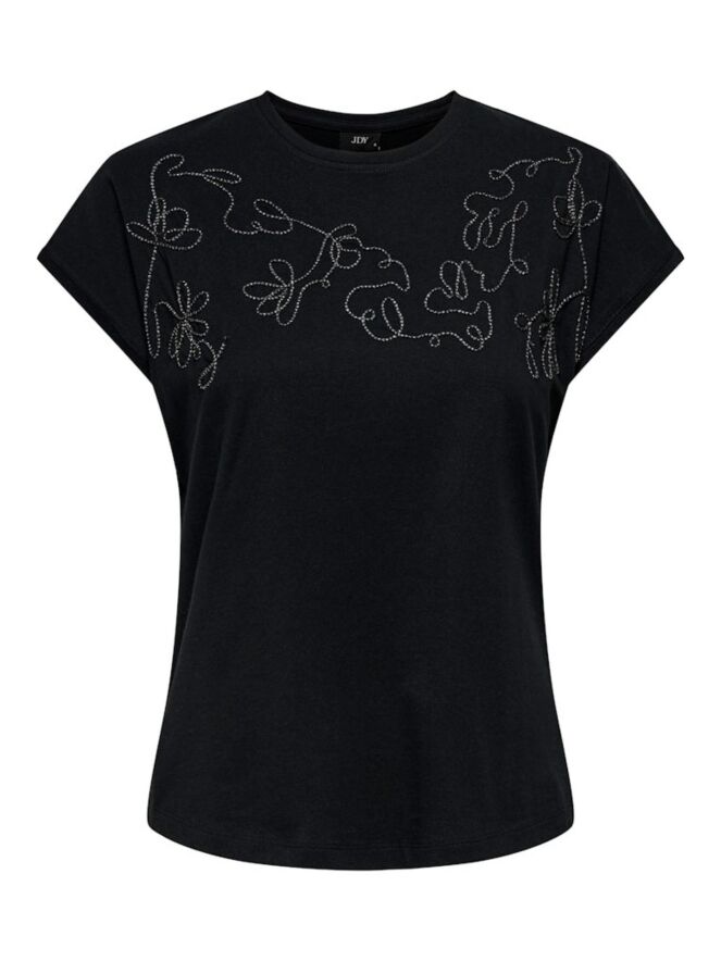 Tijdloos zwart T-shirt met een sierlijk opgestikt koordje.
