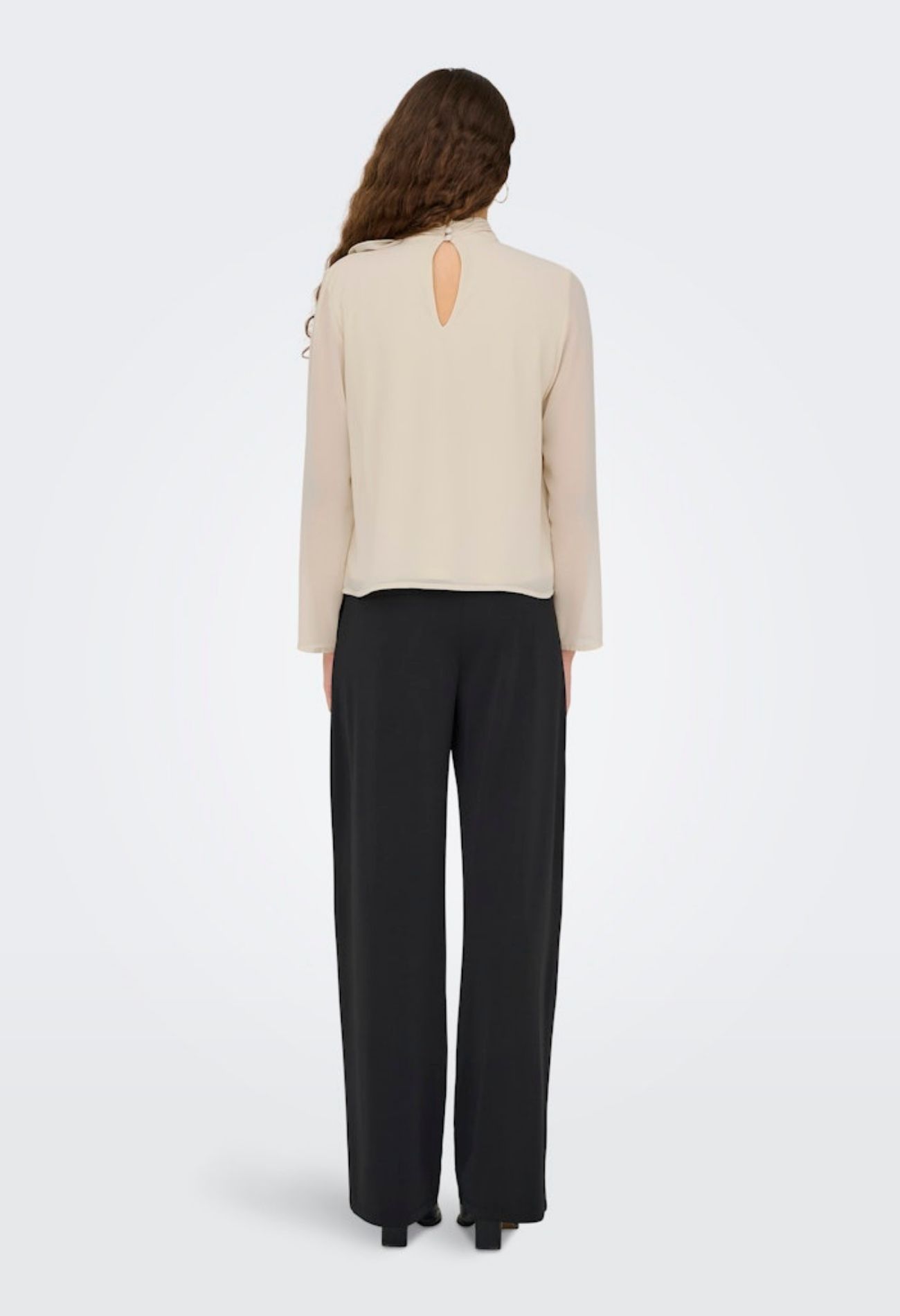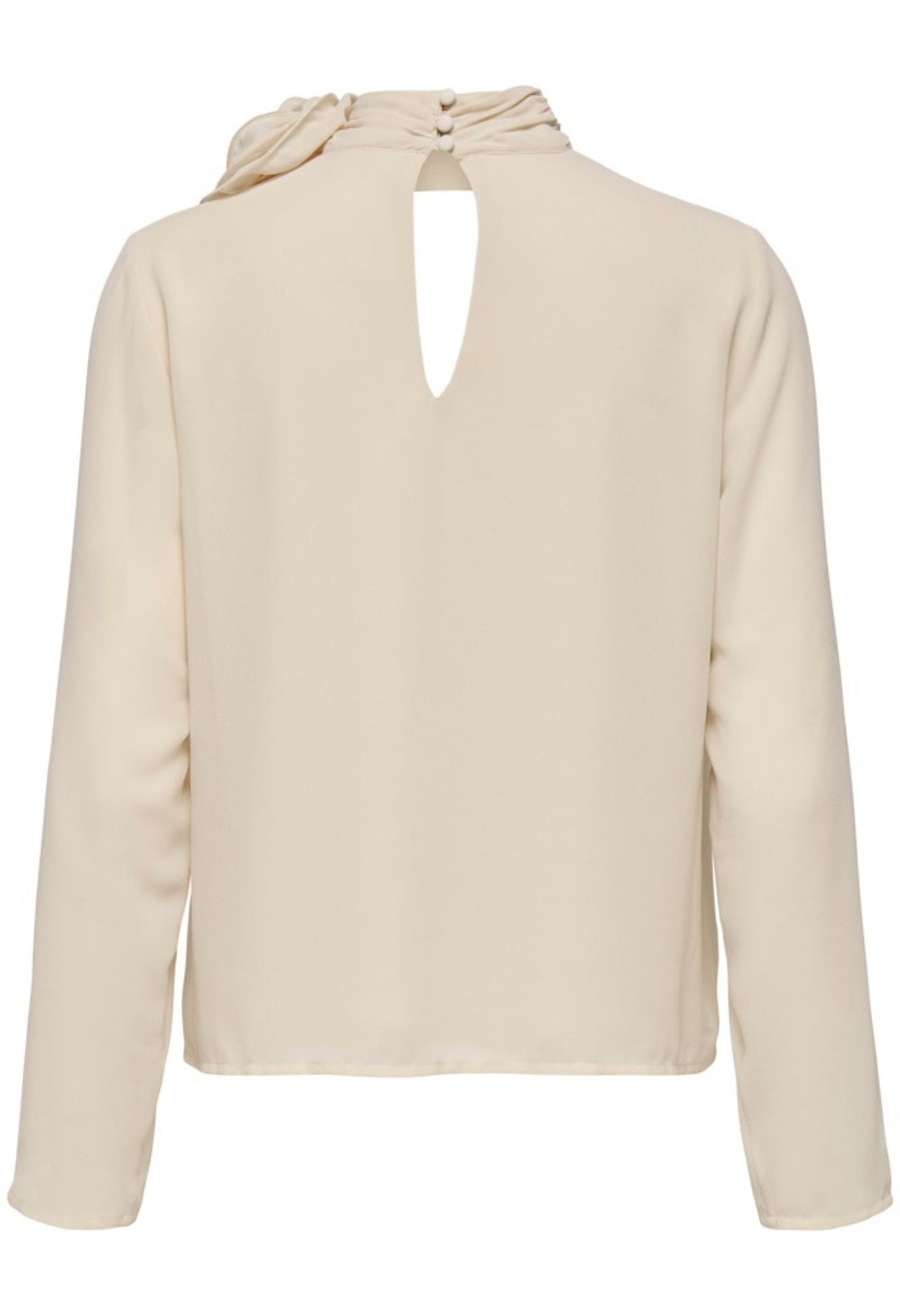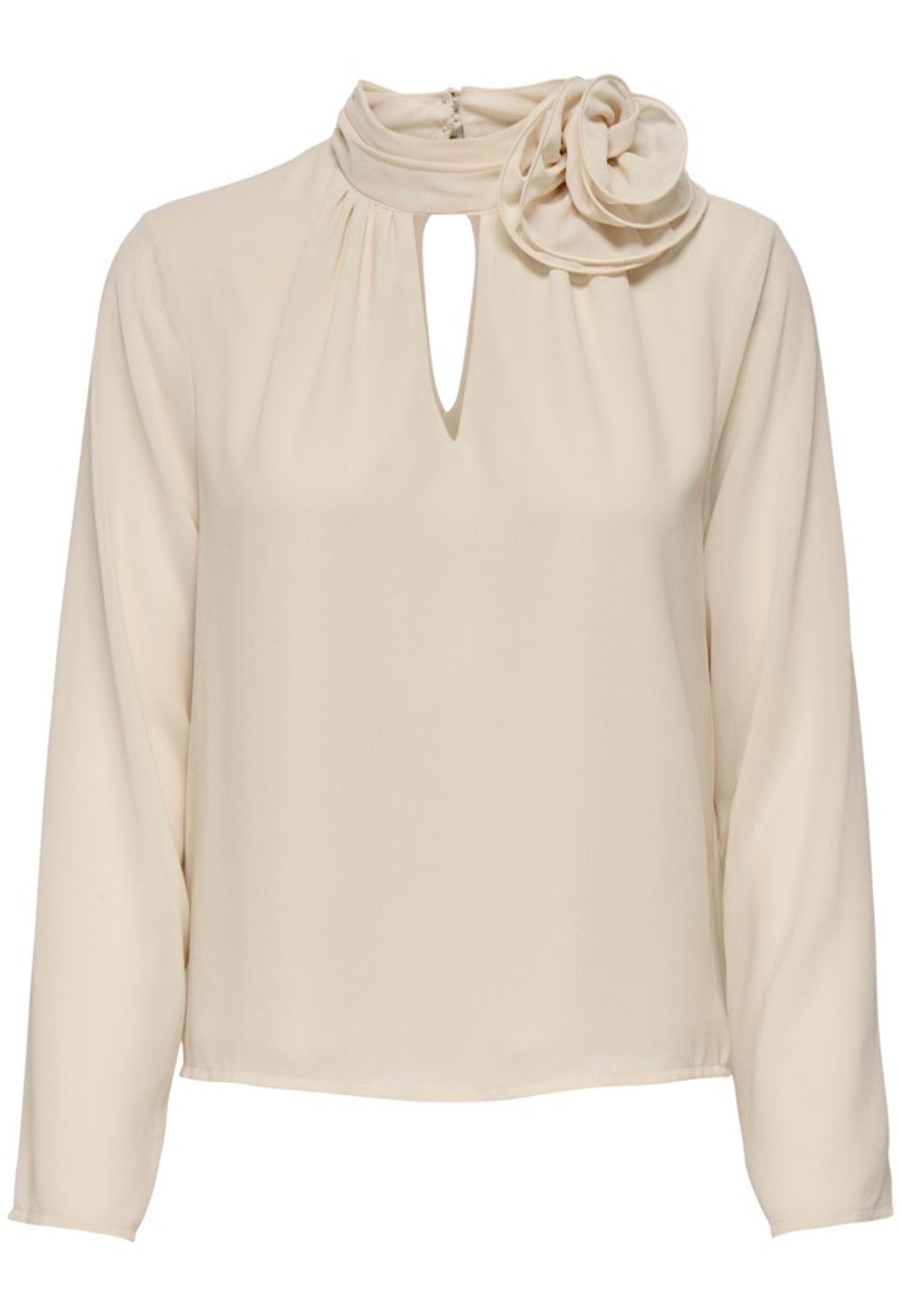 Deze sierlijke en vooral feestelijke top is er in het zwart en ecru. Met de doorschijnende mouwen, V uitsparing voor en achter en niet te missen de bloem is dit een echte blikvanger!