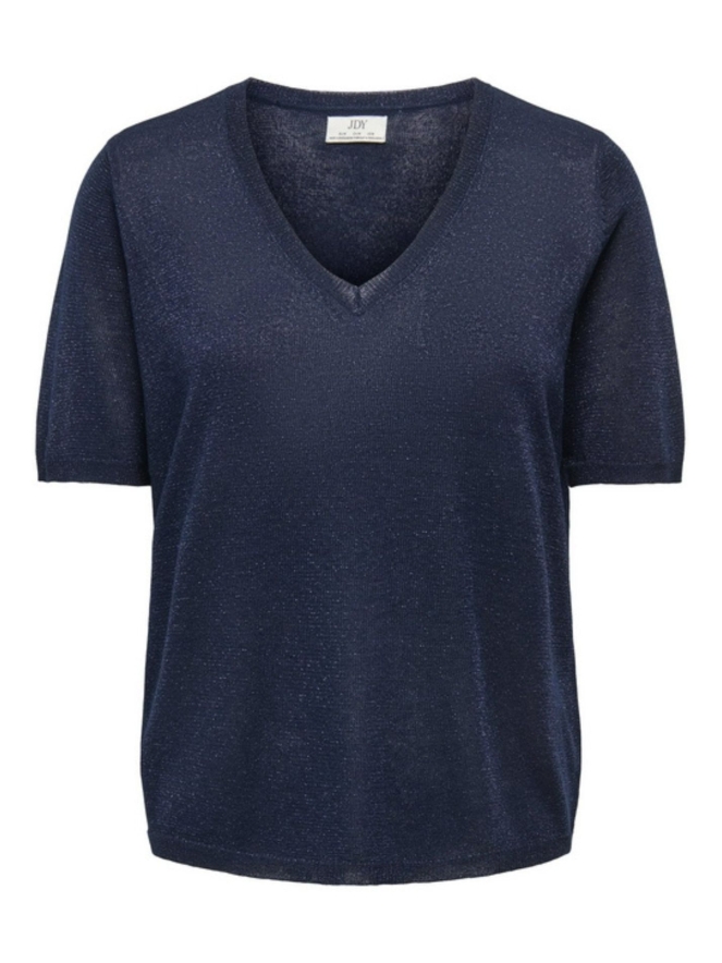 Dunne glitter pullover met een mooie V hals en korte mouwen. Deze trui heeft een lurex glitter draad ingeweven bijpassend in de kleur van de trui.