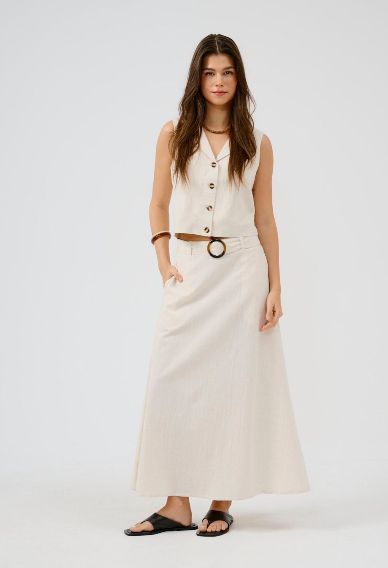 Deze elegante lange rok is vervaardigd uit een hoogwaardige linnen blend, waardoor hij licht, ademend en perfect is voor warmere dagen. De stof combineert het natuurlijke karakter van linnen met extra zachtheid en draagcomfort, zodat je moeiteloos stijl en gemak ervaart.