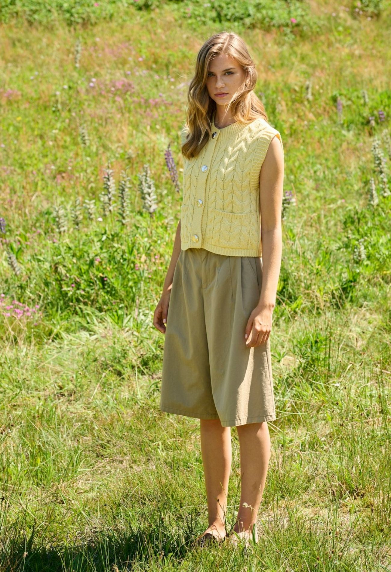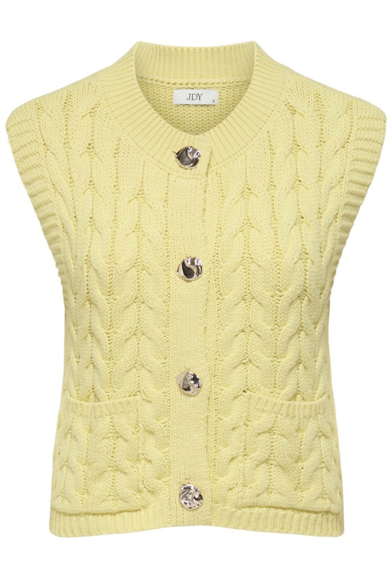 Geef je outfit een frisse en trendy upgrade met dit prachtige gilet in de populaire butter yellow kleur. Deze zachte, warme tint is dé trend van dit seizoen. Het gilet is afgewerkt met luxe goudkleurige knopen die een chique touch toevoegen. De verfijnde kabelstructuur (kabelpatroon) zorgt voor een speelse, maar stijlvolle look en maakt het item perfect voor zowel casual als geklede combinaties. Draag het gilet over een blouse voor een sophisticated outfit, of combineer het met een basic top voor een trendy, effortless look.