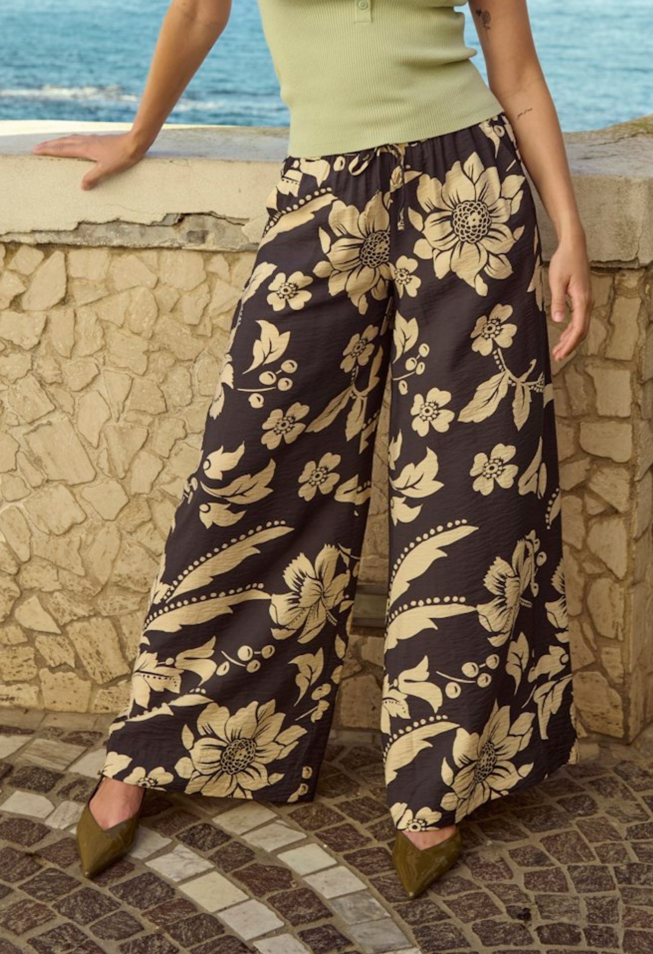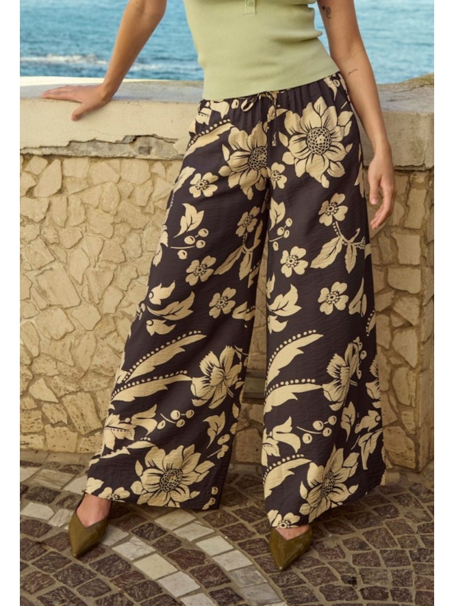 Opvallende palazzo broek met brede pijpen. Broeken met brede pijpen zijn het nieuwe silhouet voor dit seizoen. Gemaakt van viscose en dus soepelvallend en luchtig te dragen in een warm oord! En dan hebben we het nog geen eens gehad over de prachtige print....