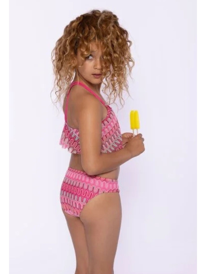 Deze super leuke meerkleurige bikini bestaande uit een broekje en top heeft een leuke los overhangende stof voor een speels effect.