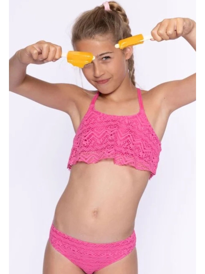 Deze mooie knal roze bikini laat jou stralen in het zonnetje! Met leuke overhangend kantwerk voor een speels effect!