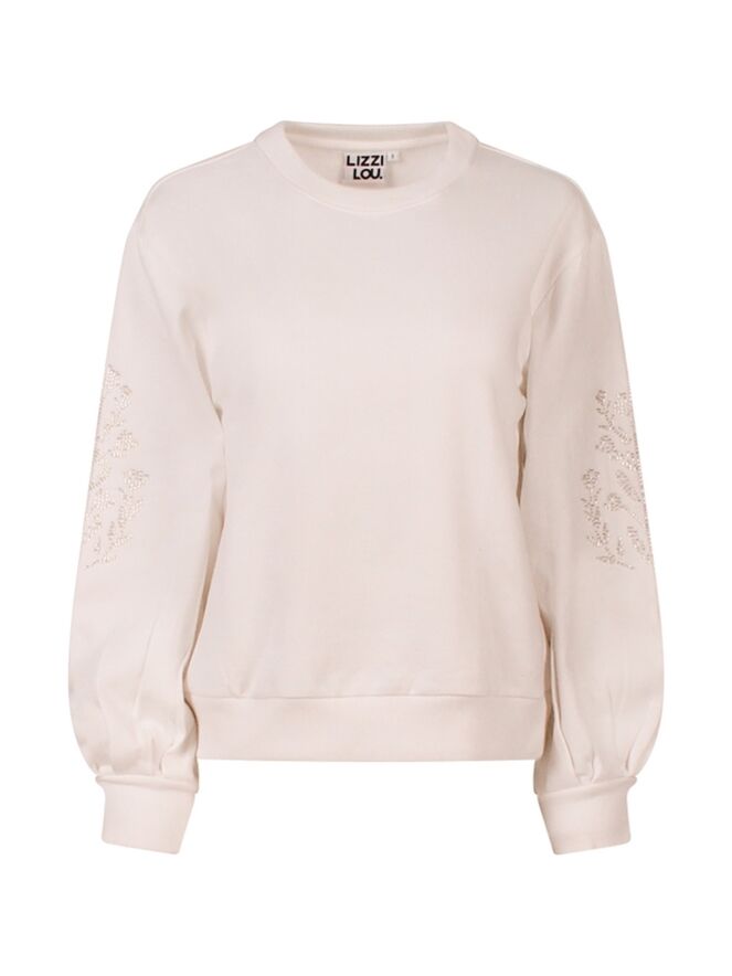 Effen gekleurde sweater met op de pofmouw kraaltjes in een bloemenpatroon. Deze trendy sweater draag je als casual item eenvoudig op jeans.