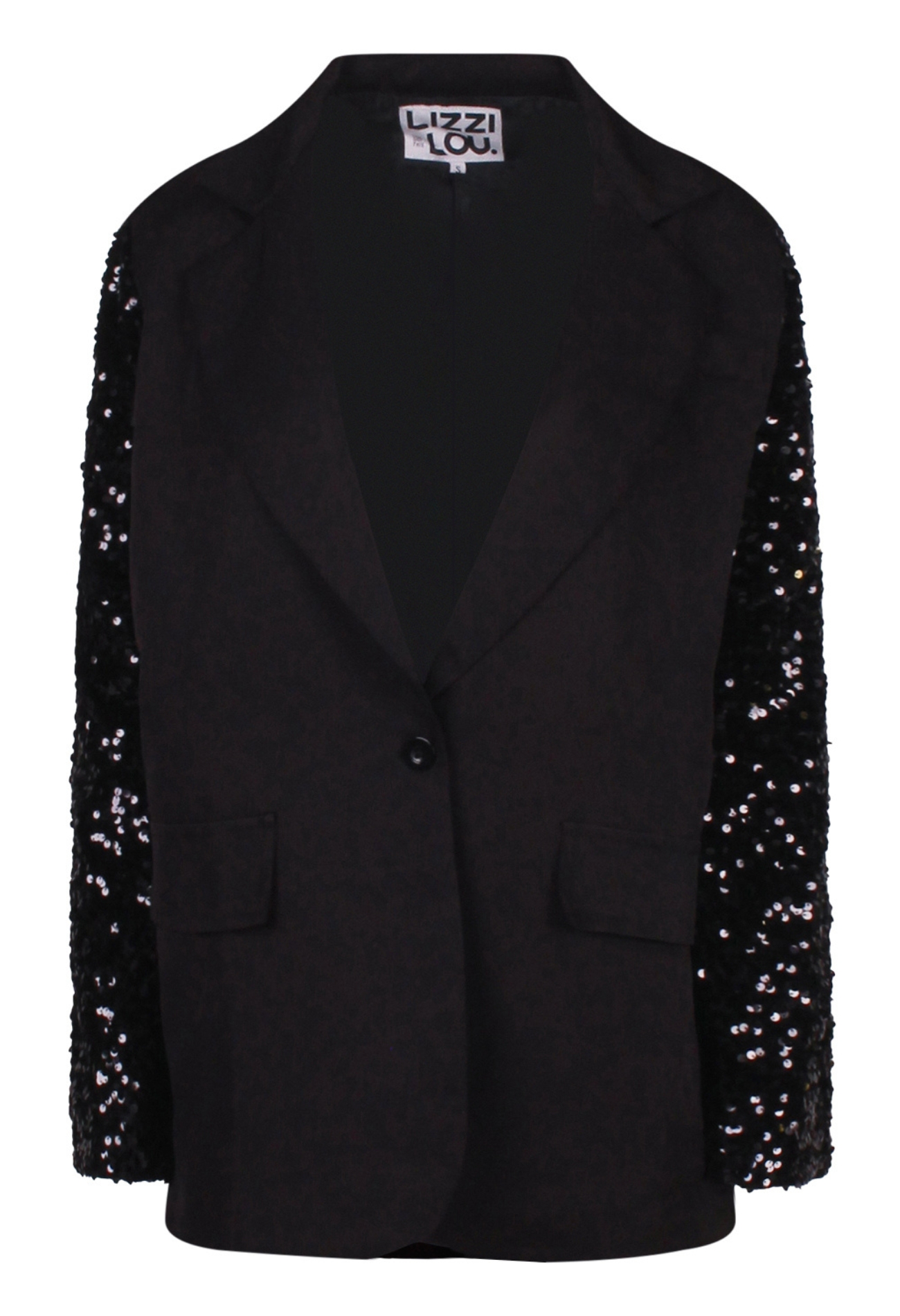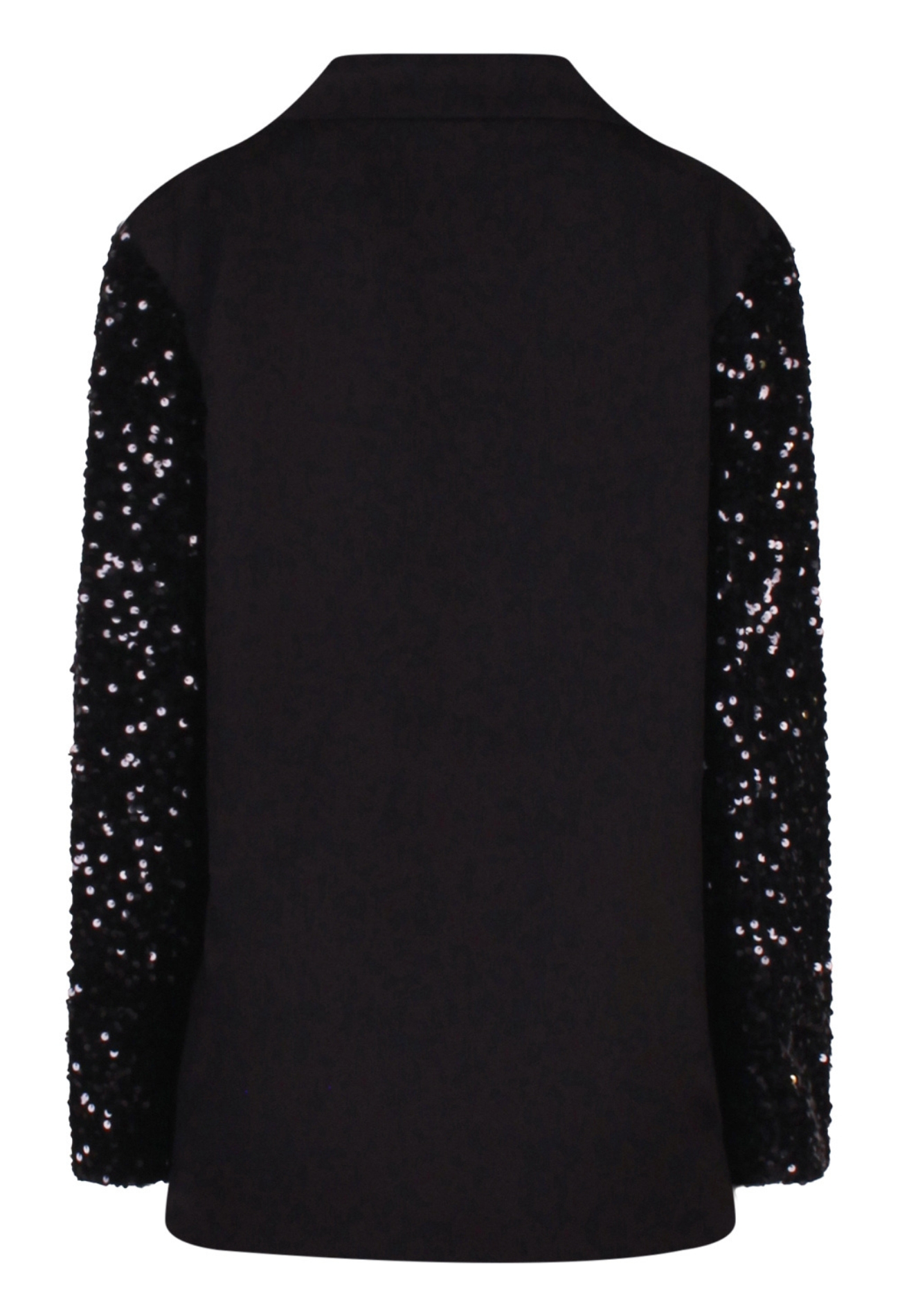 Deze oversized damesblazer heeft een klassieke reverskraag en mouwen versierd met glinsterende pailletten voor een feestelijke touch. De relaxte pasvorm maakt hem comfortabel en veelzijdig. Combineer met een pantalon voor een nette look of met een jeans voor een casual, stijlvolle outfit.