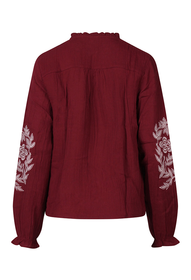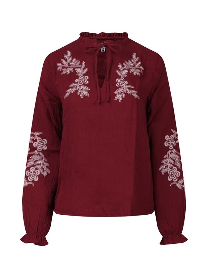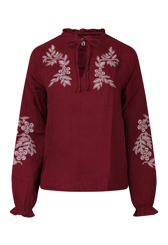 Vrouwelijk met een verfijnde touch.Dat is deze mousseline top! Met prachtige verfijnde borduursels op de borst en mouwen. De subtiele ruffel langs de halslijn geeft een romantisch accent. Perfect te combineren met een rok of pantalon voor een nette, stijlvolle look, ideaal voor werk of een speciale gelegenheid.