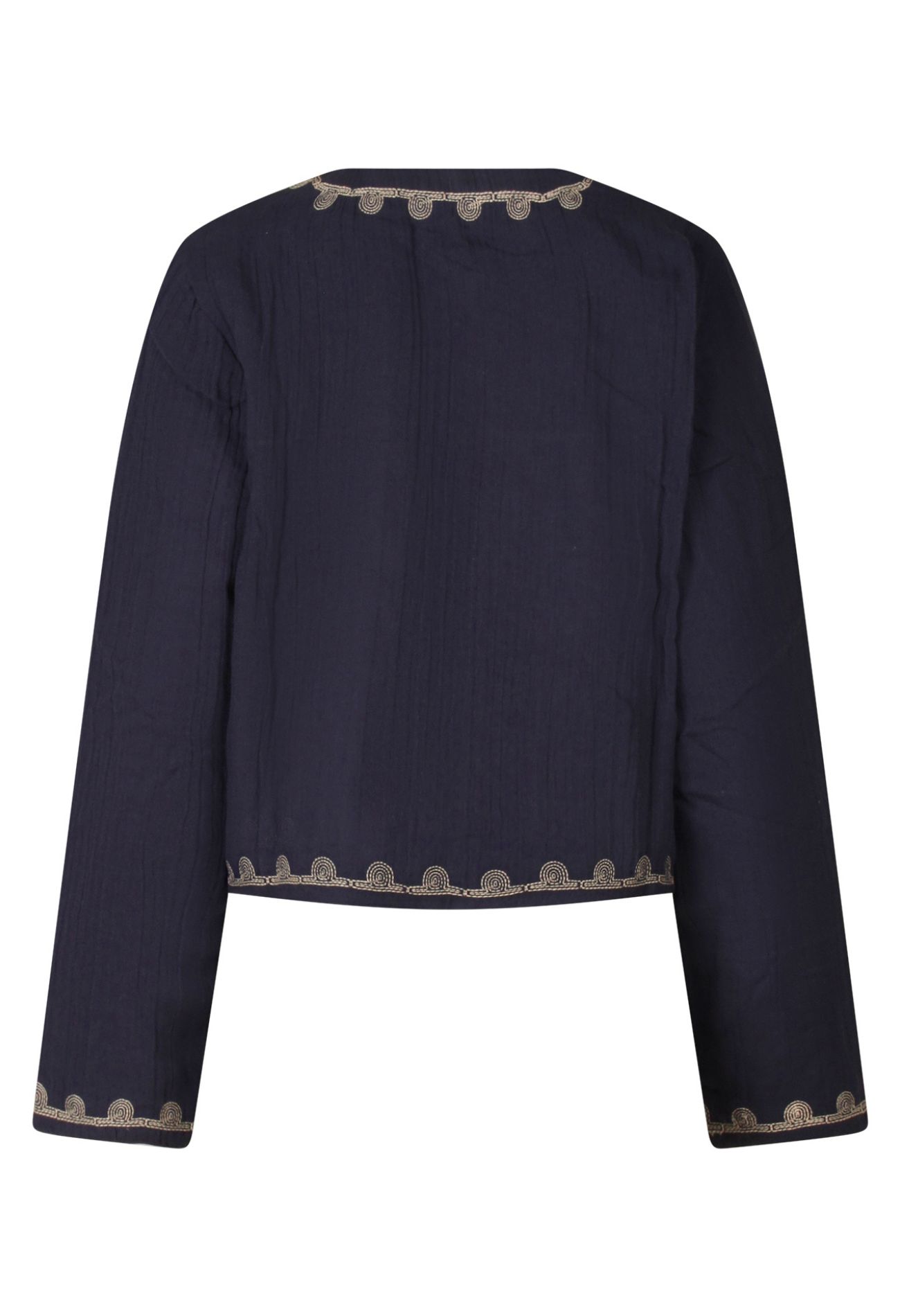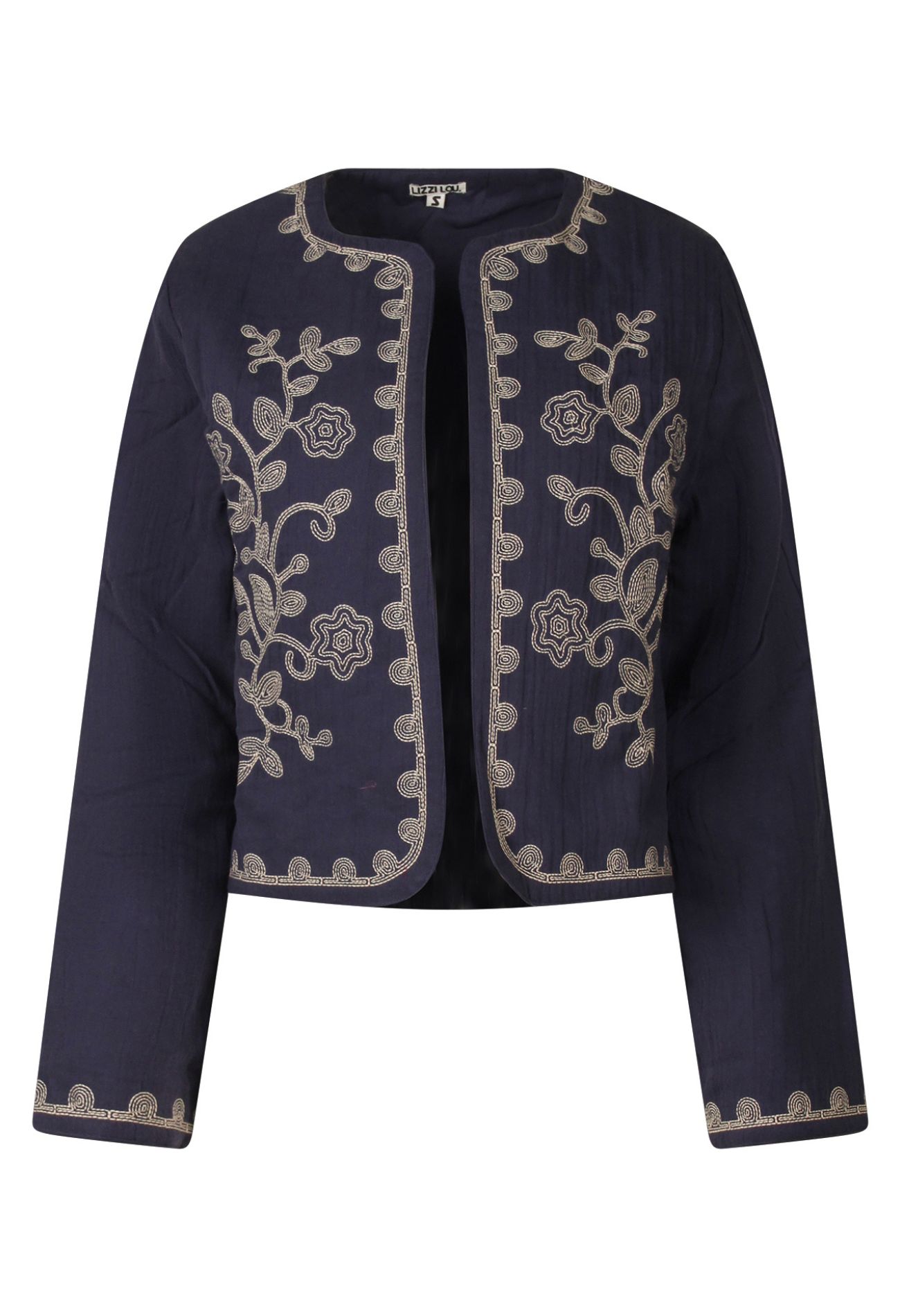 Dit gevoerde damesjack is gemaakt van zachte mousseline en afgewerkt met verfijnde borduursels op de voorkant en bij de zoom van de mouwen. De lichte padding zorgt voor comfort en warmte zonder in te leveren op stijl. Draag het jack over een jurk of met een jeans voor een moeiteloze, vrouwelijke look, perfect voor frisse dagen met een fashionable twist.