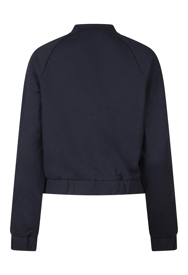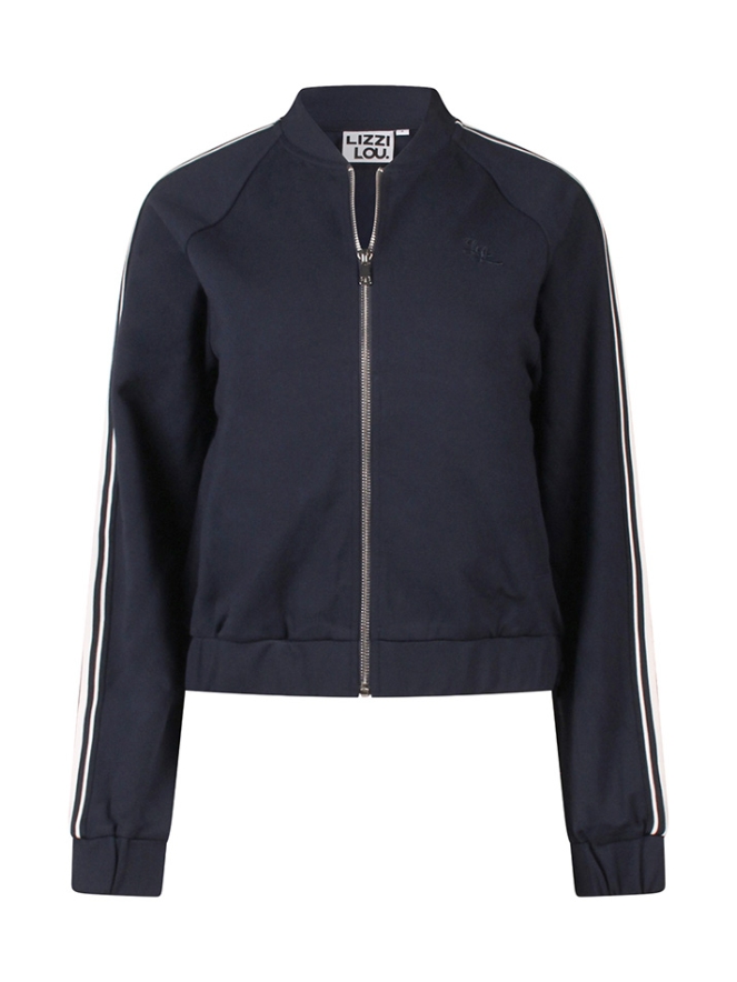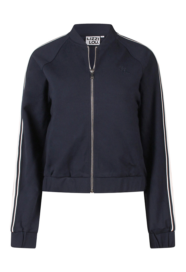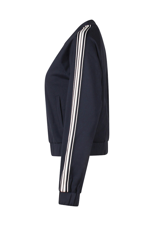 Dit sportieve vestje is onderdeel van een pak. Het bombermodel heeft een streepbies van schouder tot einde mouw met fijne steekzakken. De bijpassende pantalon ook met streep vind je onder art. nr. Z10075