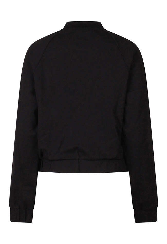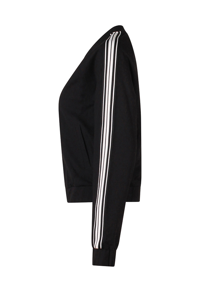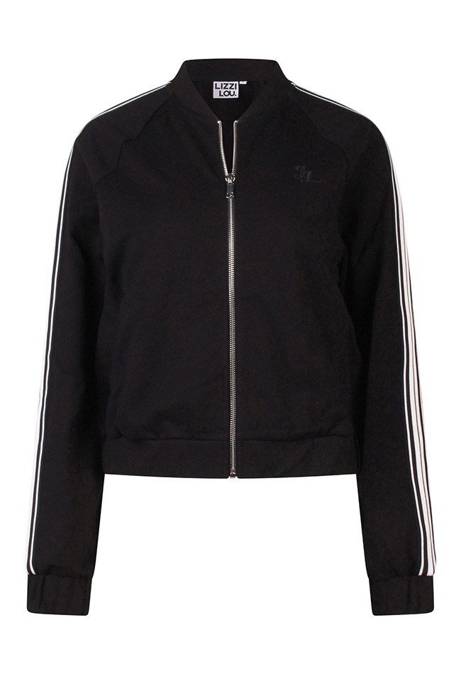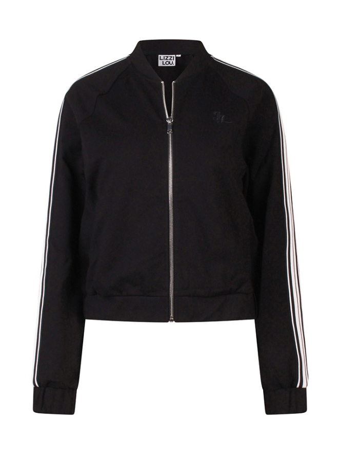 Dit sportieve vestje is onderdeel van een pak. Het bombermodel heeft een streepbies van schouder tot einde mouw met fijne steekzakken. De bijpassende pantalon ook met streep vind je onder art. nr. Z10075