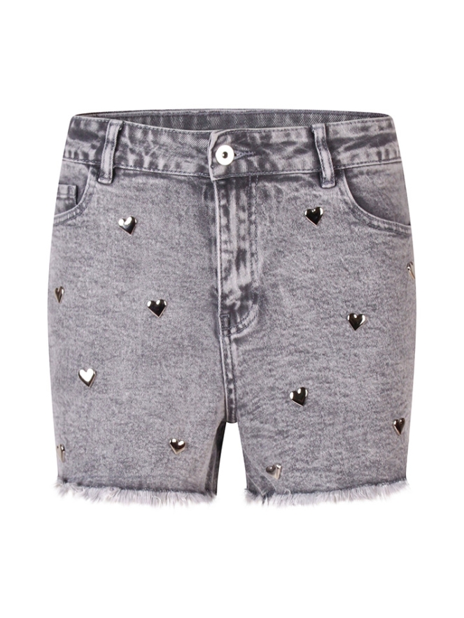 Voeg een speelse twist toe aan je zomergarderobe met deze stijlvolle high-waist denim korte broek voor dames. Voorzien van schattige hartjesstuds op de voorkant, straalt deze broek een vrouwelijke en trendy vibe uit. De licht gerafelde zoom geeft een casual, nonchalante uitstraling, perfect voor warme dagen en festivals. Combineer met een topje en sneakers voor een moeiteloze, modieuze look.