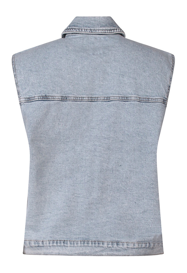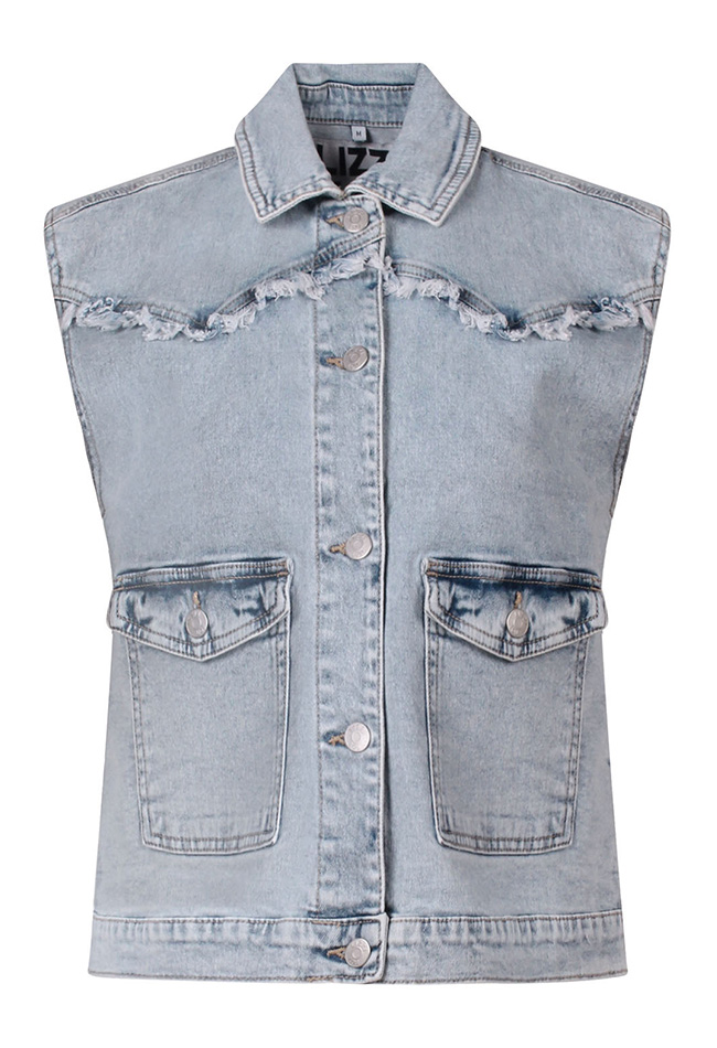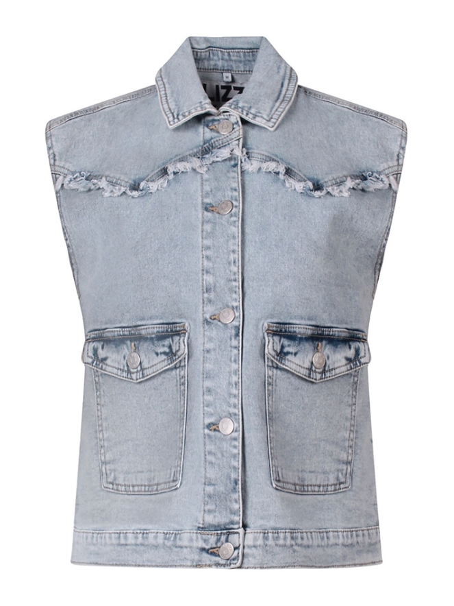 Dit trendy dames gilet van denim met speelse franjes is een echte eyecatcher. Het gilet is uitgevoerd met stijlvolle franje-details en praktische klepzakken, wat zorgt voor een stoere maar vrouwelijke uitstraling. Perfect te combineren met de bijpassende rok (Z10342) voor een complete en modieuze set, maar ook leuk over een basic top of blouse voor een casual look. Een veelzijdig item waarmee je eenvoudig een statement maakt in elke outfit.