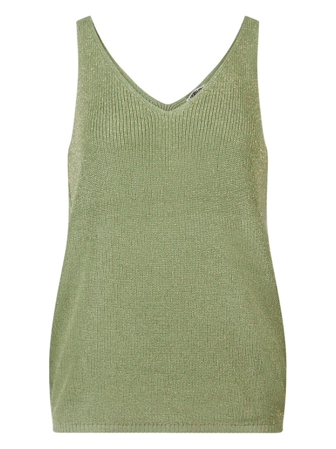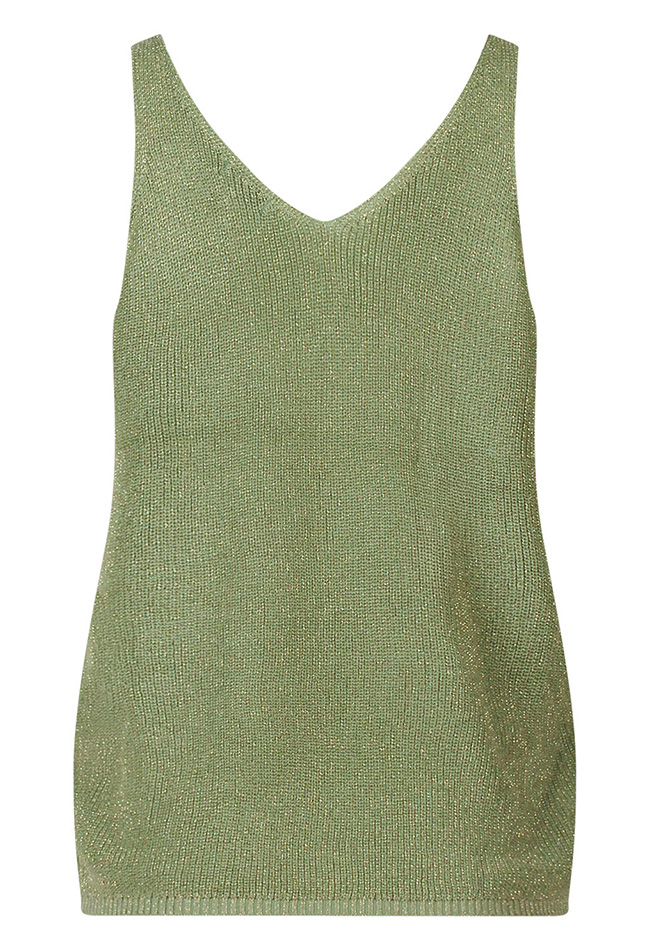 Stijlvol en vrouwelijk singlet, vervaardigd van een fijne gebreide stof met subtiele lurex draad voor een elegante, licht glanzende uitstraling. Het model heeft een flatterende V-hals aan zowel de voor- als achterkant, wat zorgt voor een verfijnde en moderne look.