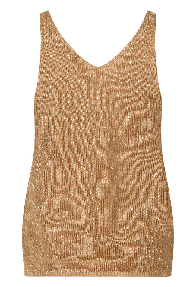 Stijlvol en vrouwelijk singlet, vervaardigd van een fijne gebreide stof met subtiele lurex draad voor een elegante, licht glanzende uitstraling. Het model heeft een flatterende V-hals aan zowel de voor- als achterkant, wat zorgt voor een verfijnde en moderne look.