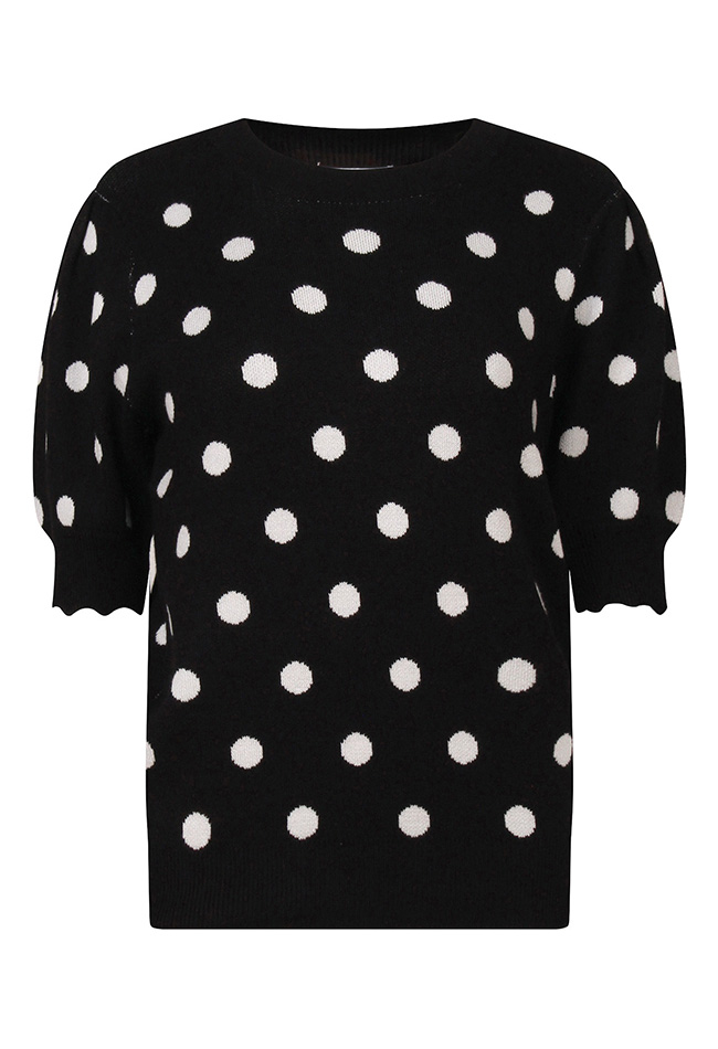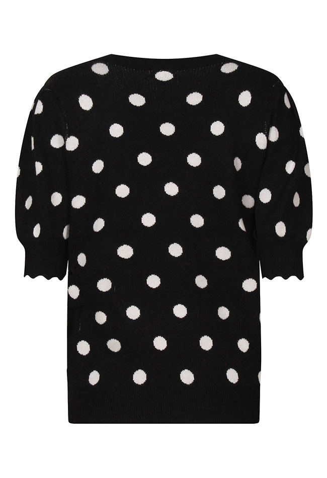 Dots! Deze mooie trui in een sweatermodel zit vol met stippen. Punt. Met korte mouw met een mooie golvende afwerking. Leuk ook jeans maar zeker ook op een mooie effen rok!