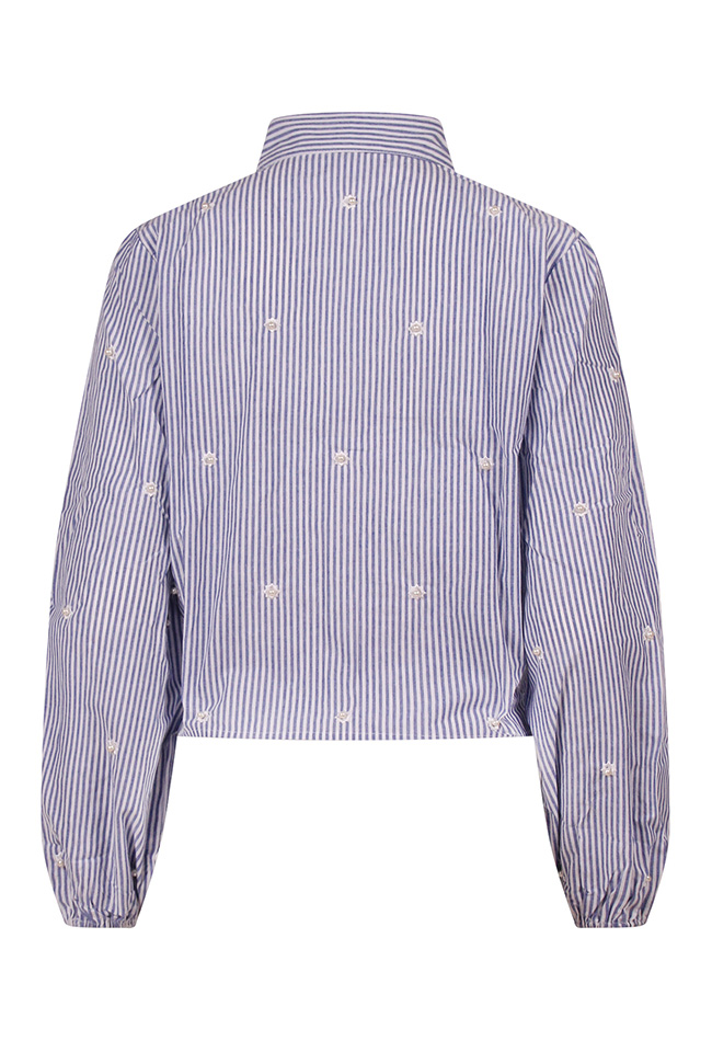 Dit leukerdje is een 100% katoenen knoopblouse. De blousjes met streep hebben opgestikte pareltjes. Het witte blousje heeft geen pareltjes maar een allover geborduurde bloemenprint op de stof. Alle bloesjes hebben een elastiekje aan het uiteinde van de mouw.
