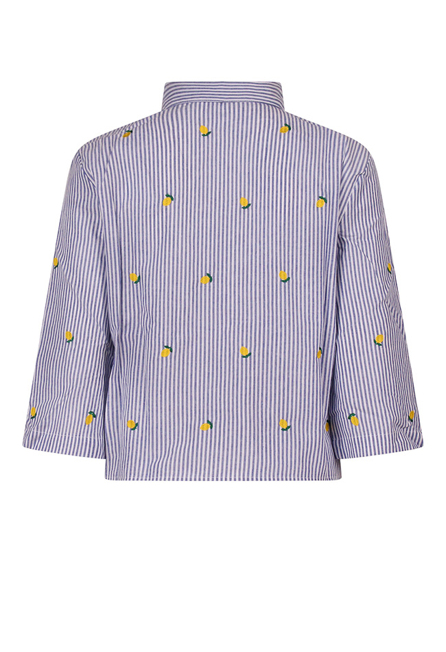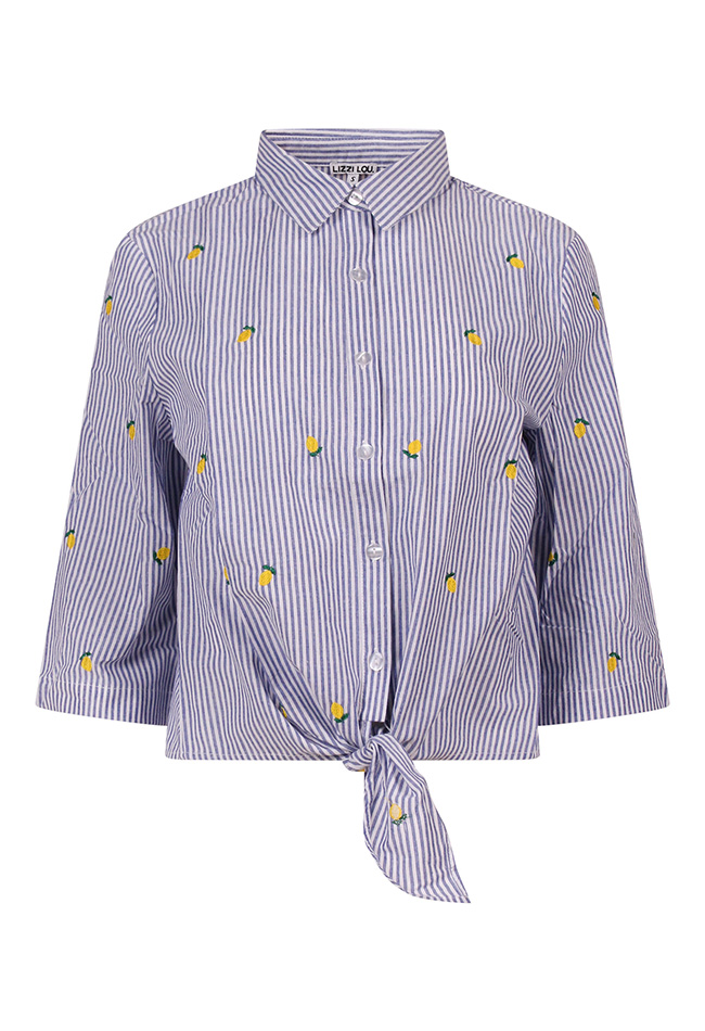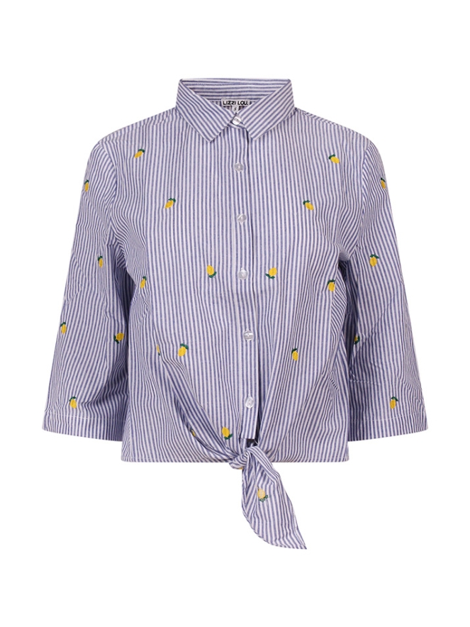Geknoopte blousjes zijn helemaal hot, borduur er fruit op en ze zijn hot en cool! Dit leuke knoopblousje heeft beide! Wit en blauw gestreept met citroenen, roze gestreept met een tros kersen.