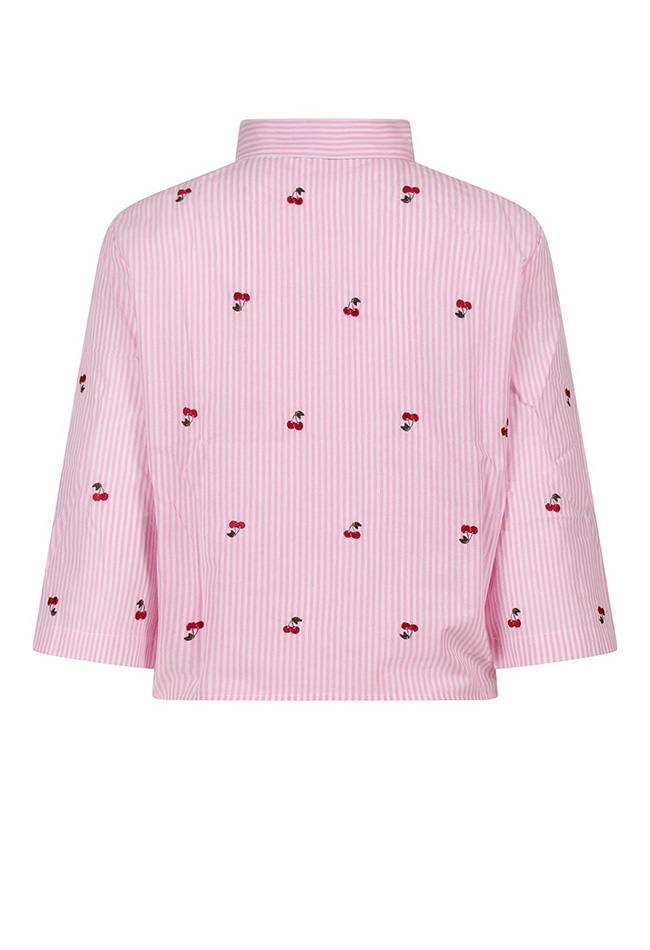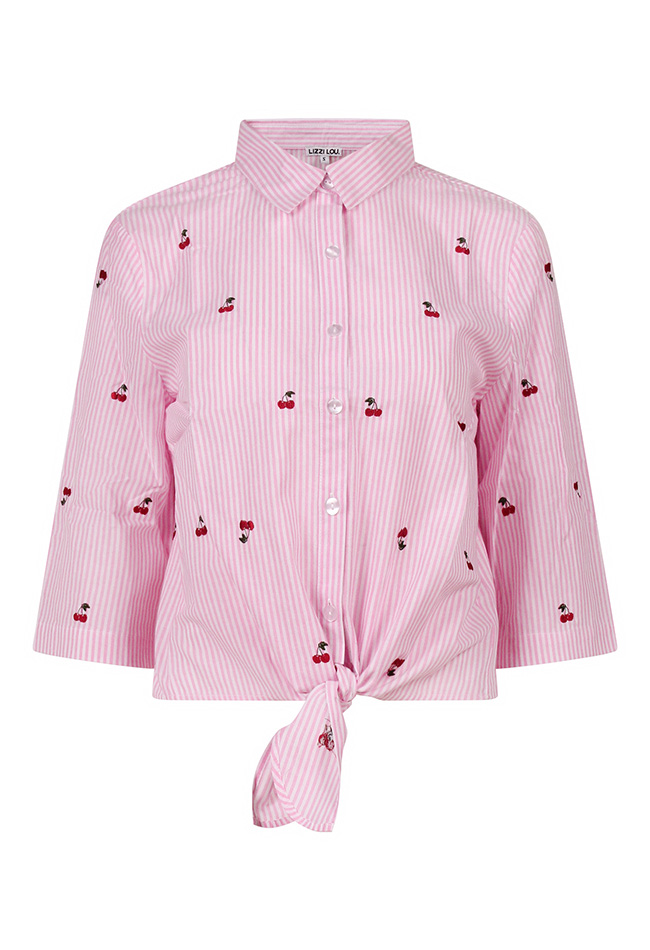 Geknoopte blousjes zijn helemaal hot, borduur er fruit op en ze zijn hot en cool! Dit leuke knoopblousje heeft beide! Wit en blauw gestreept met citroenen, roze gestreept met een tros kersen.