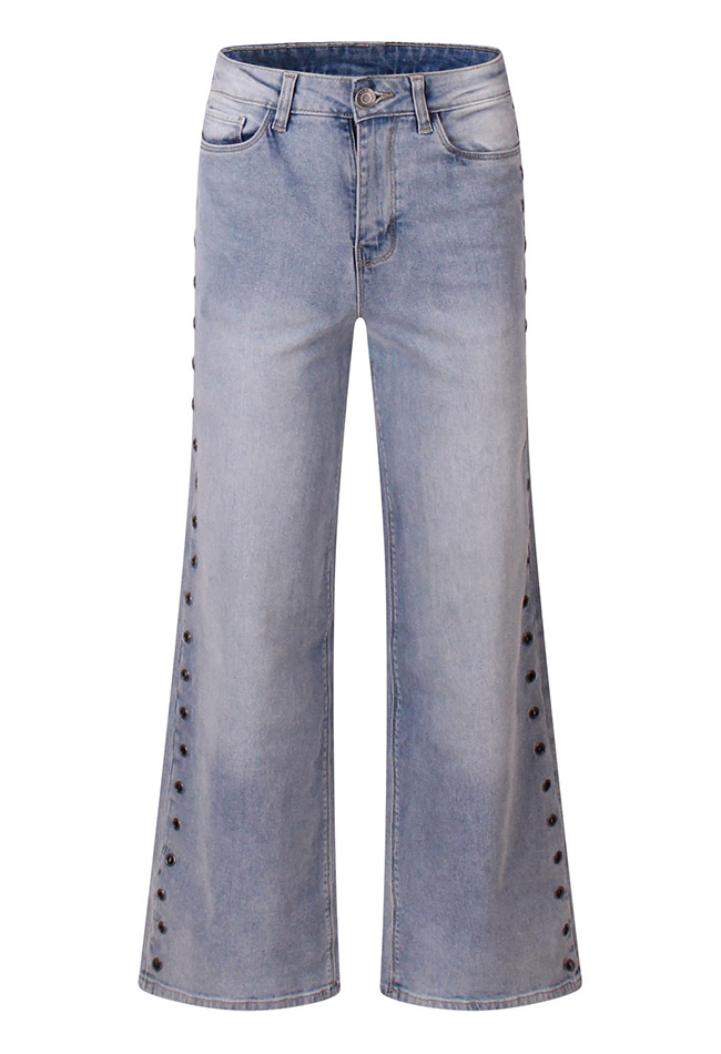 Deze spijkerbroek geeft een frisse, jonge uitstraling en combineert comfort met opvallende details. De ringen aan de zijkant van het been zorgen voor een edgy, trendy touch die direct in het oog springt. De wijde pijpen maken de pasvorm relaxed en fashionable, waardoor de broek zowel casual als stylish gedragen kan worden. Perfect voor diegene die een stoere look met een eigentijds accent zou willen.