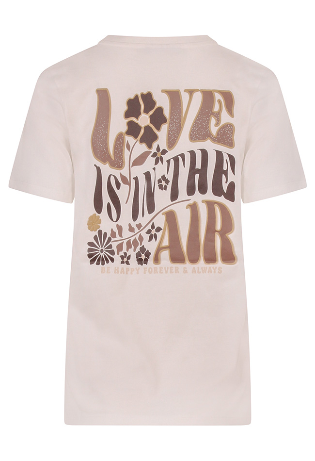 Fris, vrolijk en helemaal klaar voor het voorjaar! Dit T-shirt van Lizzy Lou verrast met een sprankelende print op de rug met de tekst ?Love is in the Air?. Een speelse en positieve boodschap die perfect past bij zonnige lentedagen.