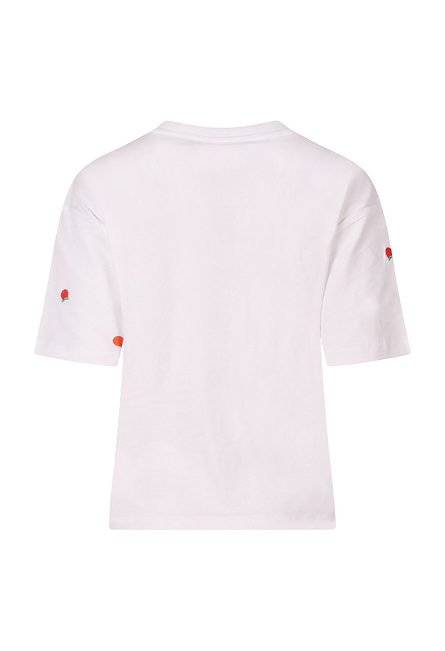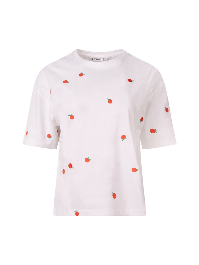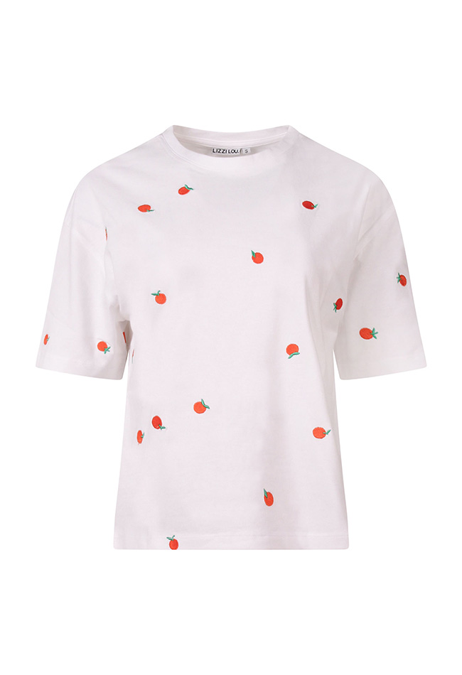 Trendy T-shirt met citroenen, kersen of sinaasappels. Het zijn kleine borduringen en vind je over het gehele voorpand. Let op, dit shirt valt wat wijder en is een boxy fit.