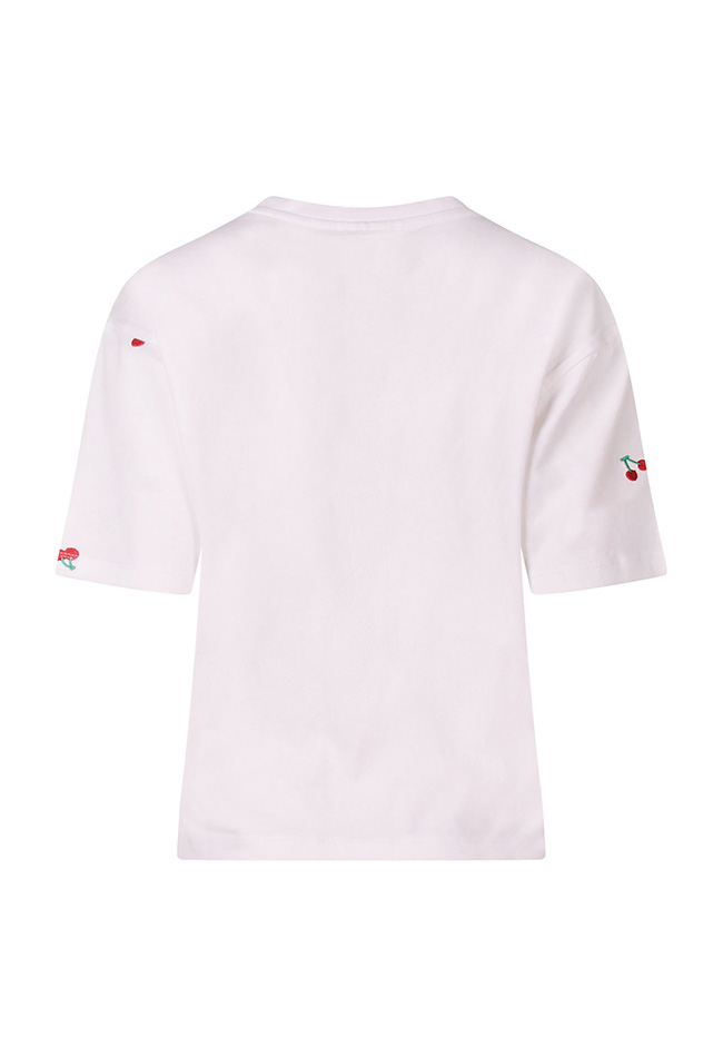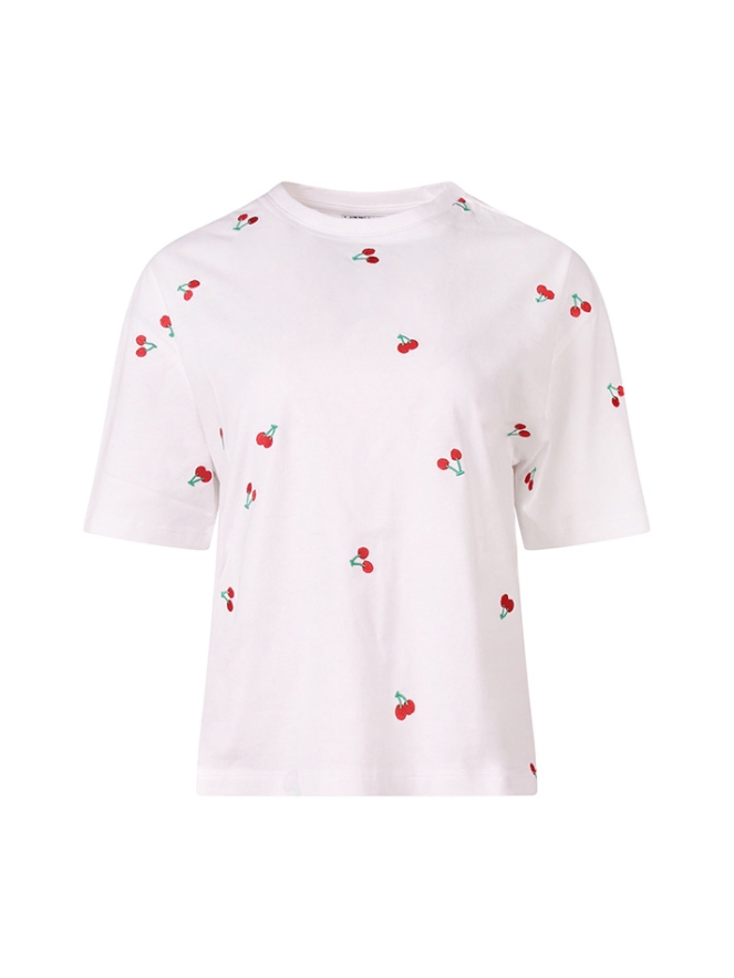 Trendy T-shirt met citroenen, kersen of sinaasappels. Het zijn kleine borduringen en vind je over het gehele voorpand. Let op, dit shirt valt wat wijder en is een boxy fit.
