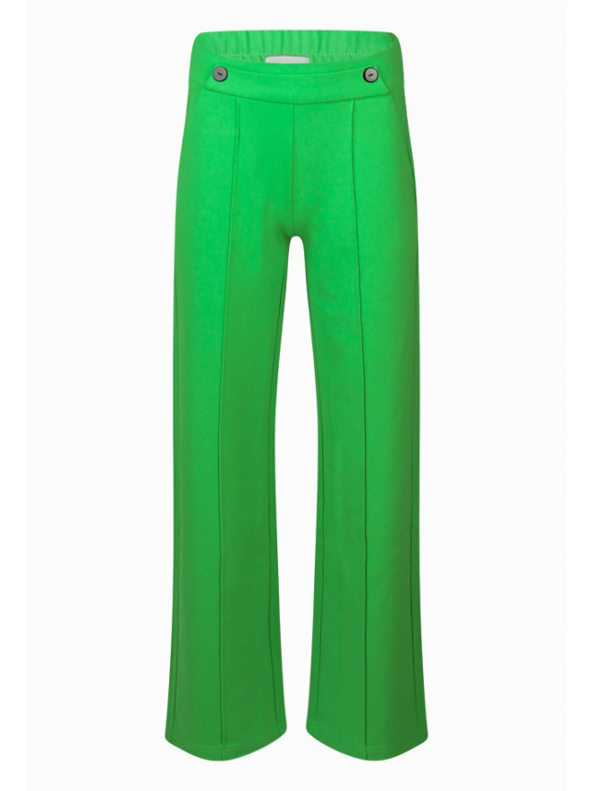 Deze broek heeft wijde pijpen en een opnaad die over de bovenkant van het been loopt.