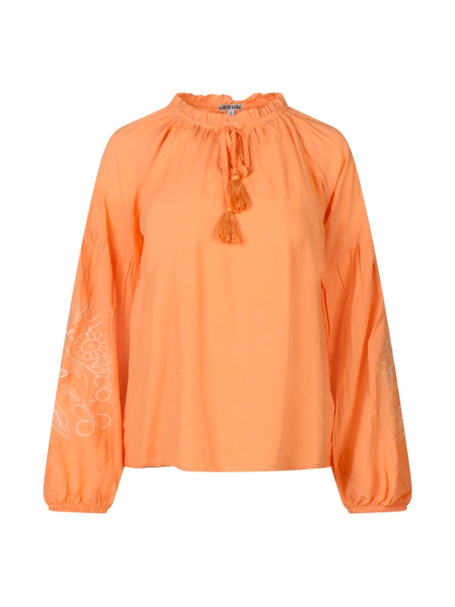 Deze ruimvallende top met ballonmouwen heeft een bloem borduursel op beide mouwen. Rond de kraag zit een ruche rand en voor bij de hals een uitsparing met kwastjes. Dezelfde top is ook verkrijgbaar voor meisjes met art.nr. Z80267