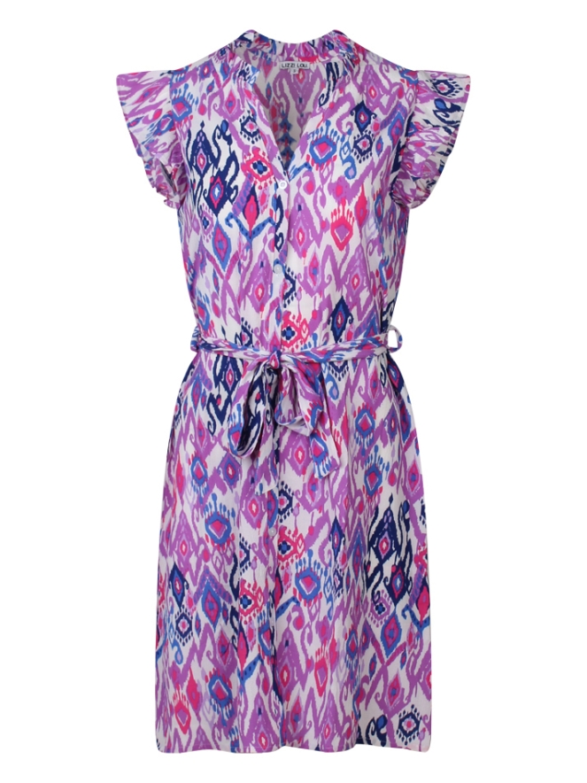 Dit vrolijke doorknoop jurkje heeft een strikceintuur in de middel en ruche ronde de hals. In dezelfde print is er ook een blouse en rokje verkrijgbaar onder art.nr. Rokje Z80442, Blouse Z80443