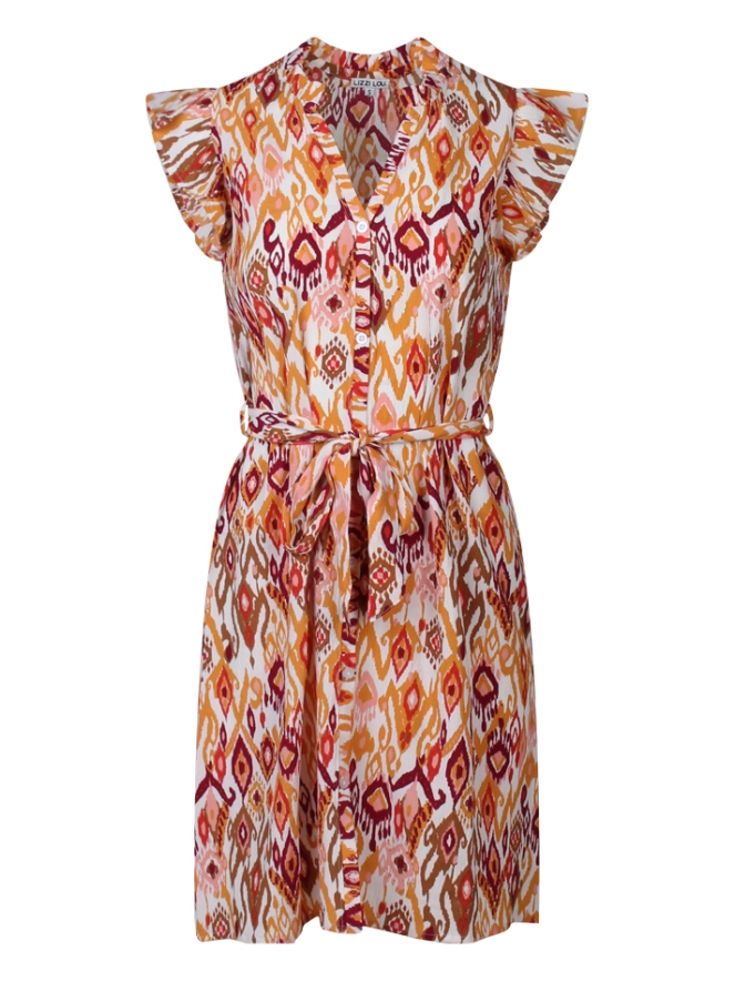 Dit vrolijke doorknoop jurkje heeft een strikceintuur in de middel en ruche ronde de hals. In dezelfde print is er ook een blouse en rokje verkrijgbaar onder art.nr. Rokje Z80442, Blouse Z80443