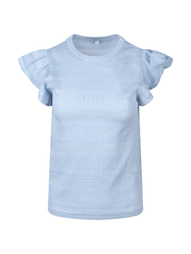 Dit T-shirt heeft ruche mouwtjes, een gestructureerd ajour patroon en een ronde hals.