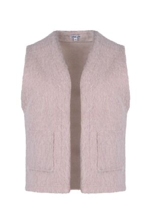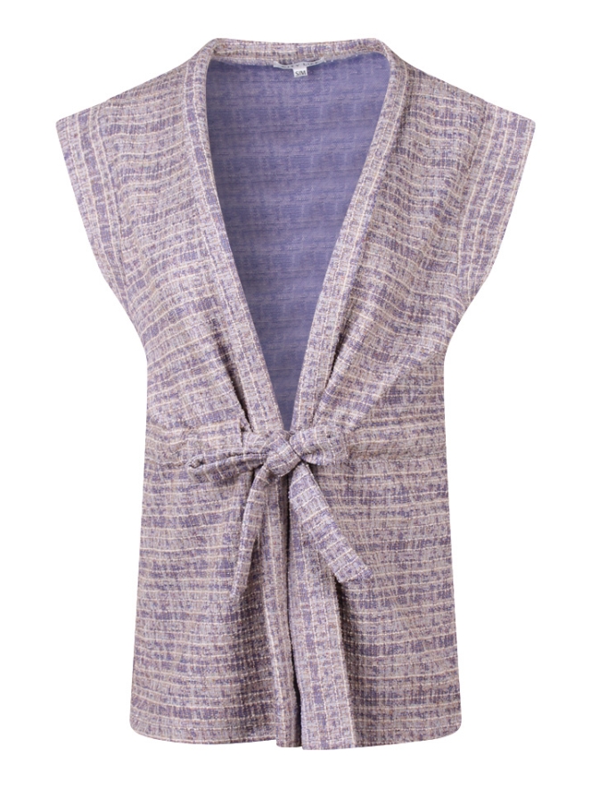 Dit giletje heeft een kapmouwtje en strikceintuur. De boucle stof geeft het gilet een luxe uitstraling.