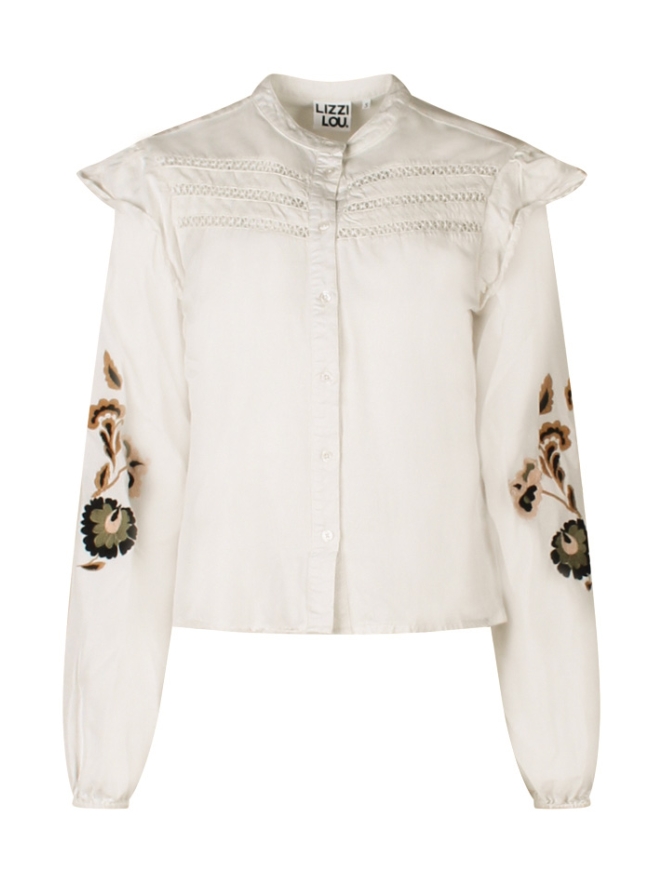 Prachtige blouse van ons eigen jeugdige merk Lizzy Lou met mooi bloemenborduursel op de mouwen. Deze blouse heeft meerdere ingezette transparante lace lijnen. Deze blouse is helemaal hot en on-trend en een ware aanvulling op jouw garderobe deze zomer.