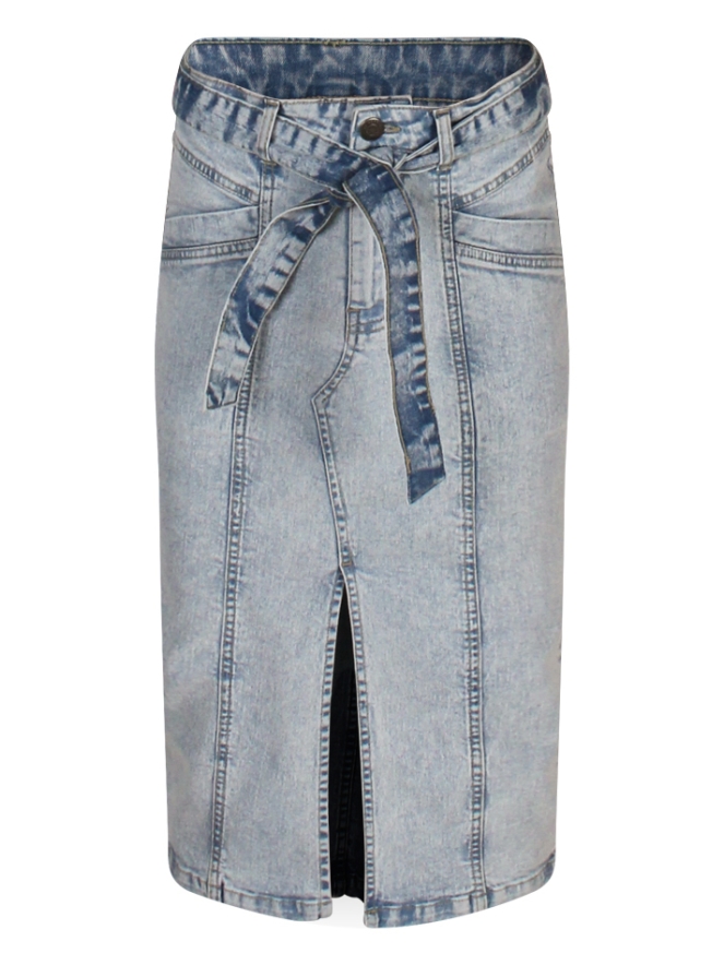 Deze spijkerrok met een beetje stretch heeft leuke details zoals verschillende deelnaden en een bijpassende denim strikceintuur. Leuk te combineren met een T-shirtje en een kleurlijke sneaker.