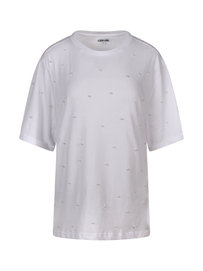 Trendy T-shirt vol met parelstuds. De rug hebben ze voor je vrij gehouden, zo kan jij nog lekker zitten. Combineer het met een leuke jeans of korte broek, slipper of sneaker en je bent ready to go...