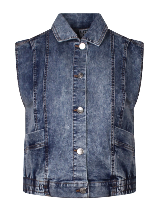 Dit dames denim gilet van Lizzi Lou uit de zomercollectie 2025 combineert een stoere bleached look met een vrouwelijke pasvorm dankzij de elastische taille. Het gilet is gemaakt van een comfortabele stretchstof met katoen, polyester en elastaan, en is afgewerkt met een klassieke kraag, kapmouwen en een knoopsluiting. Steekzakken maken het ontwerp zowel praktisch als stijlvol. Ideaal voor een heerlijk zomerse outfit, of over een sweater op de koude avonden.