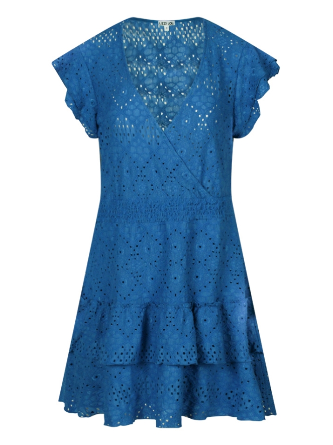 Deze damesjurk is gemaakt van een verfijnde ajourstof en straalt vrouwelijke elegantie uit. De jurk heeft sierlijke ruchemouwen en een speelse strokenrok die zorgt voor extra zwierigheid.