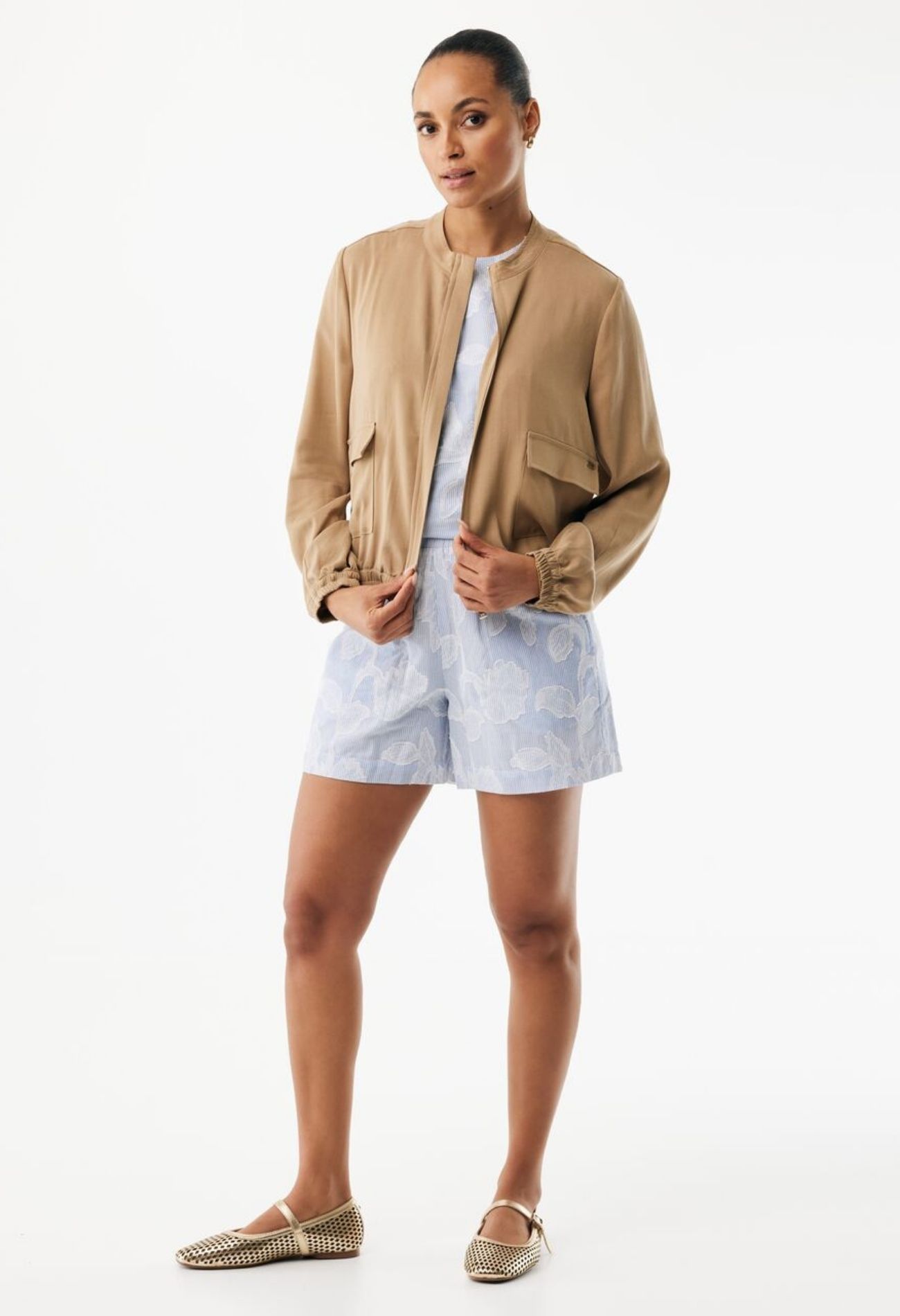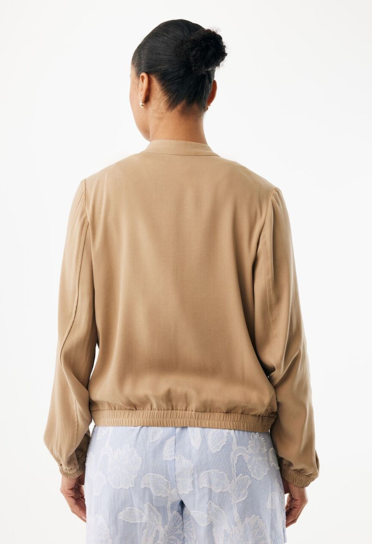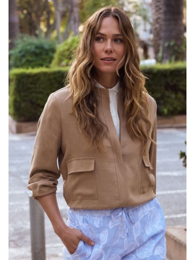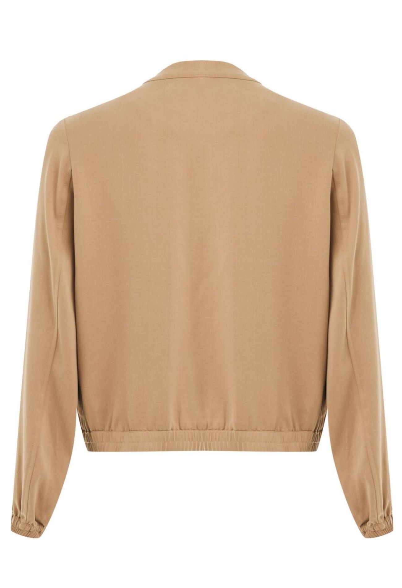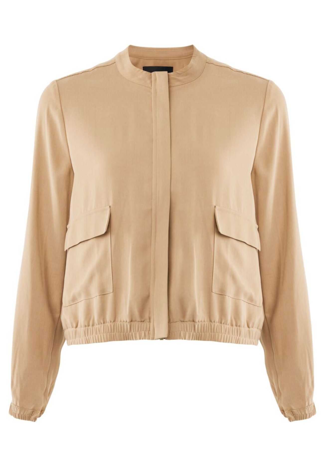 Prachtig dull satin bomberjacket in een prachtige camel kleur. Dit vestje laat je eenvoudig iets bollen door de elastische tailleband een slag naar binnen te draaien. Let op, de stof is kwetsbaar en dient met zorg behandeld te worden.