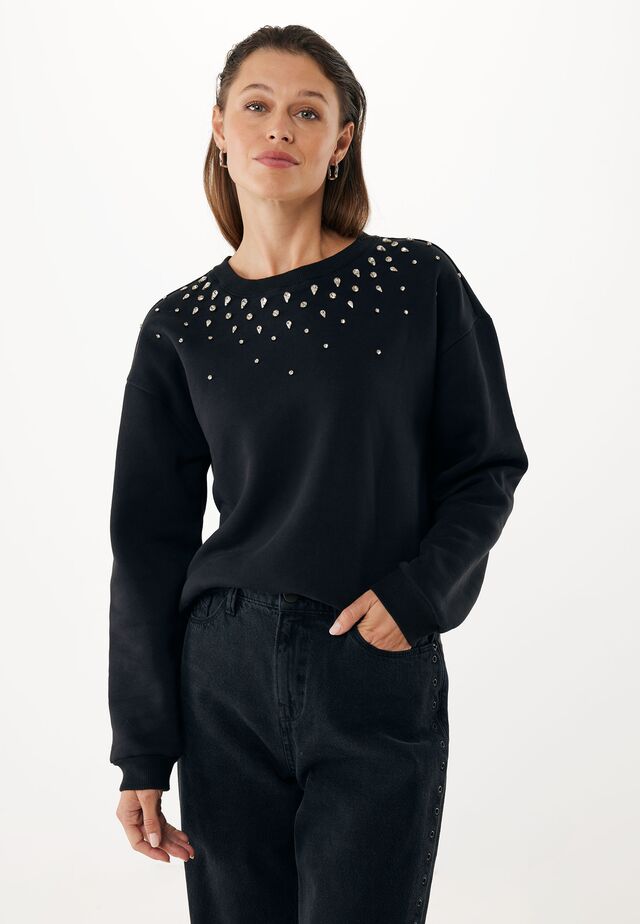 Fijne Mexx sweater met prachtige bling stenen in kastjes. Voorzichtigheid geboden met wassen i.v.m. de kwetsbaarheid van de stenen.