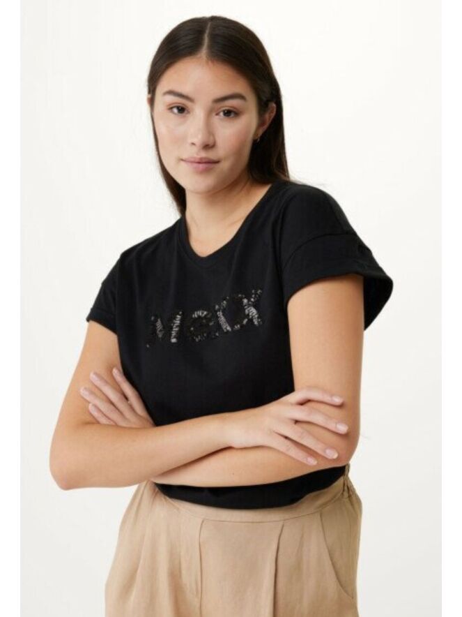 Basic T-shirt met voorop MEXX in pailletten. Makkelijk te combineren onder gilets, blazers etc... Dit shirt heeft een loose fit.