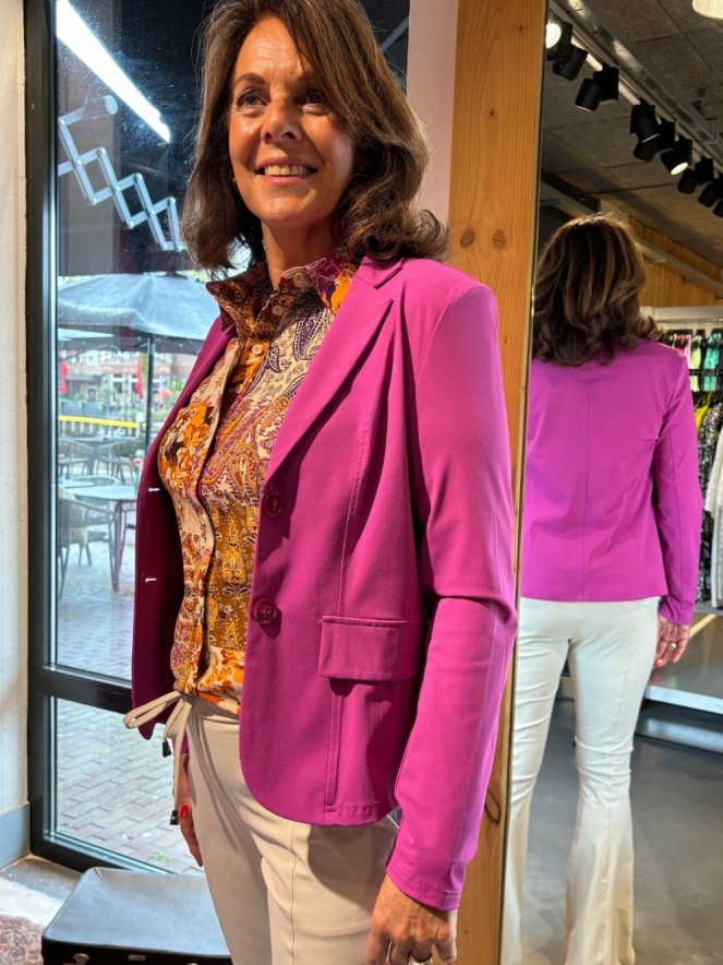 Travel blazer van Mi Piace. Een goede basis voor in iedere kledingkast. Met bijna ieder seizoen een frisse nieuwe kleur. Nieuwste kleur Espresso!