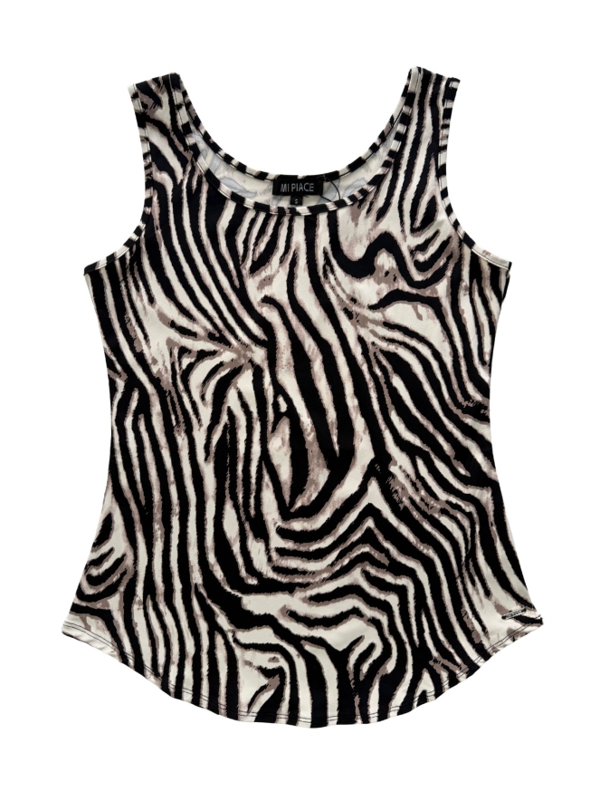 Super leuke singlet in hemdmodel van de welbekende travel stof van Mi Piace. Dit hemdje is rond aan de onderkant en heeft een trendy zebra print.