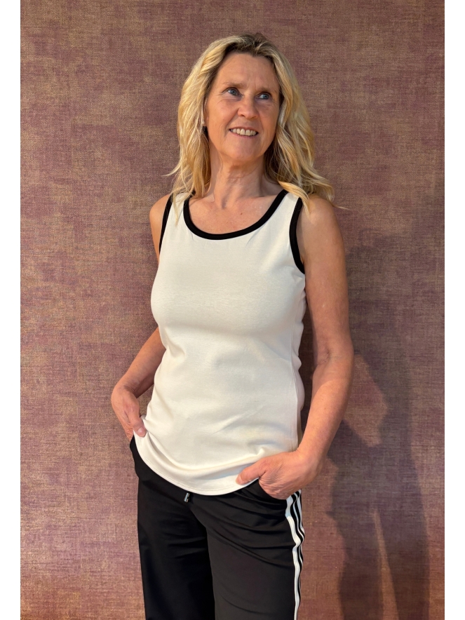 Deze basic singlet heeft een gekleurde bies. Bestaat uit 50% katoen en is een wat dikker exemplaar. De kleur matcht perfect met de blazer met art.nr. 202667