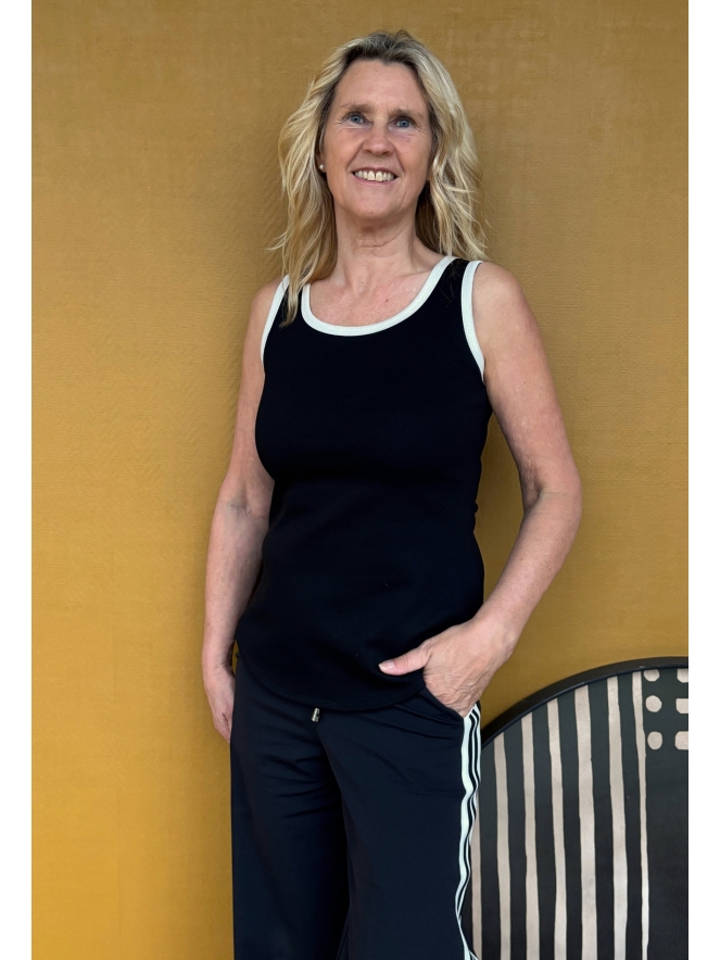 Deze basic singlet heeft een gekleurde bies. Bestaat uit 50% katoen en is een wat dikker exemplaar. De kleur matcht perfect met de blazer met art.nr. 202667