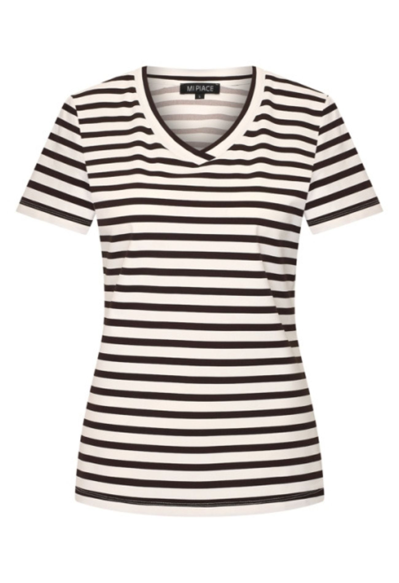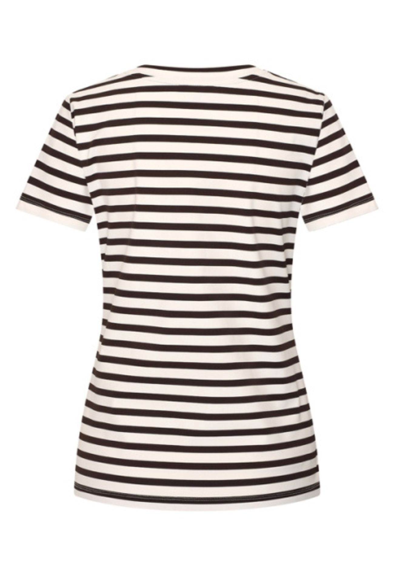 Dit klassieke T-shirtje combineert stijl en comfort in één. Uitgevoerd in een donkerbruin/wit gestreept patroon en gemaakt van hoogwaardige travelstof, voelt het shirt zacht, soepel en comfortabel aan op de huid.