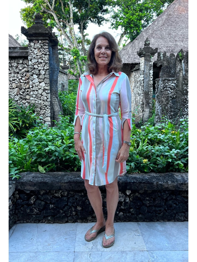 Doorknoopjurk van travel stof met vrolijke zachte kleurrijke print. Deze kreukvrije jurk biedt ultiem draagcomfort dankzij de stretch. De bijgevoegde ceintuur accentueert prachtig de taille. Een veelzijdige keuze voor elke gelegenheid. Handen in de zakken en GO!