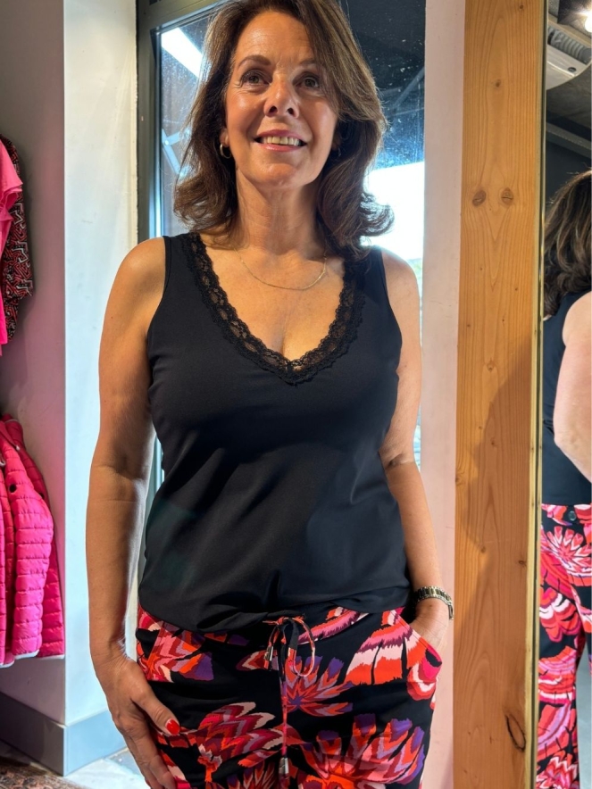Travel singlet met een kanten v-hals. Dit hempje heeft een effen kleur en loopt rond af.