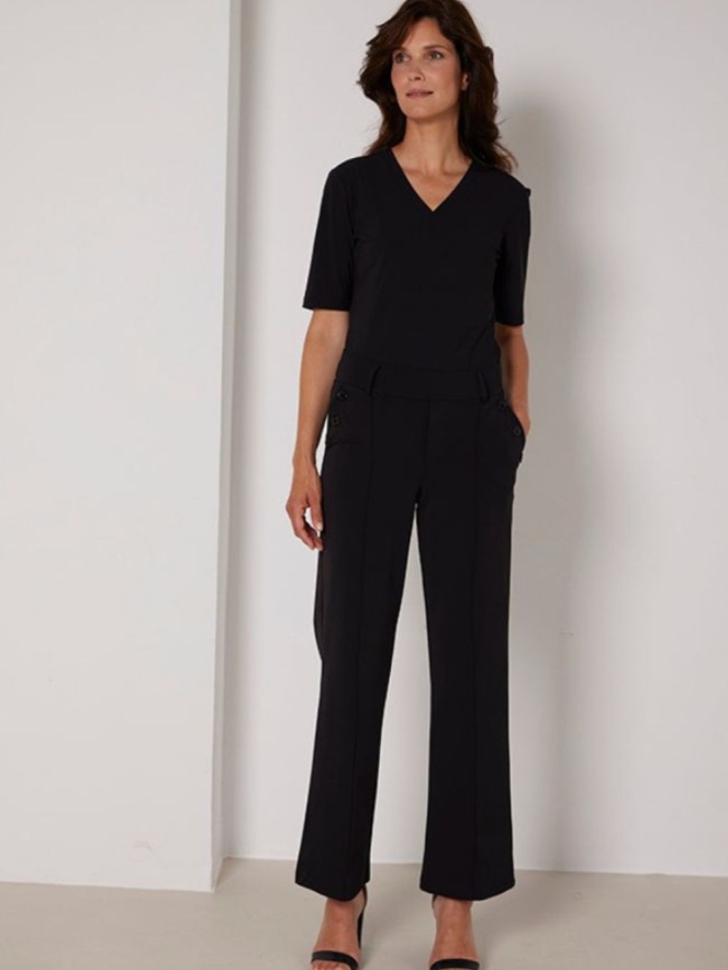 Deze broek van travel stof is een recht model en heeft knopen bij de zak met een siernaad opnaad die voor over het been loopt.